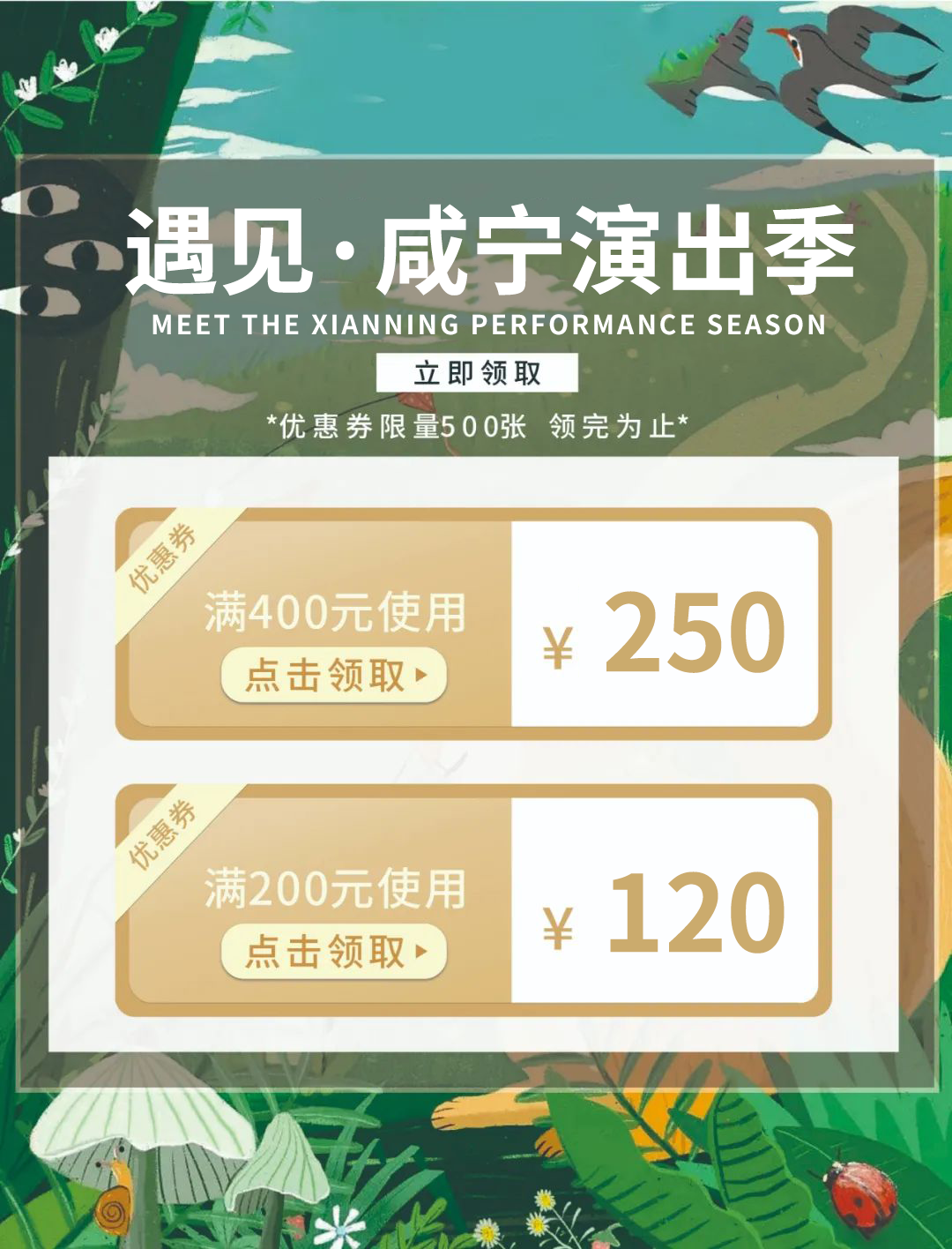 “香城大剧院”微信公众号内领取“文化惠民满减电子消费券”,消费满400元减250元,满200元减120元。