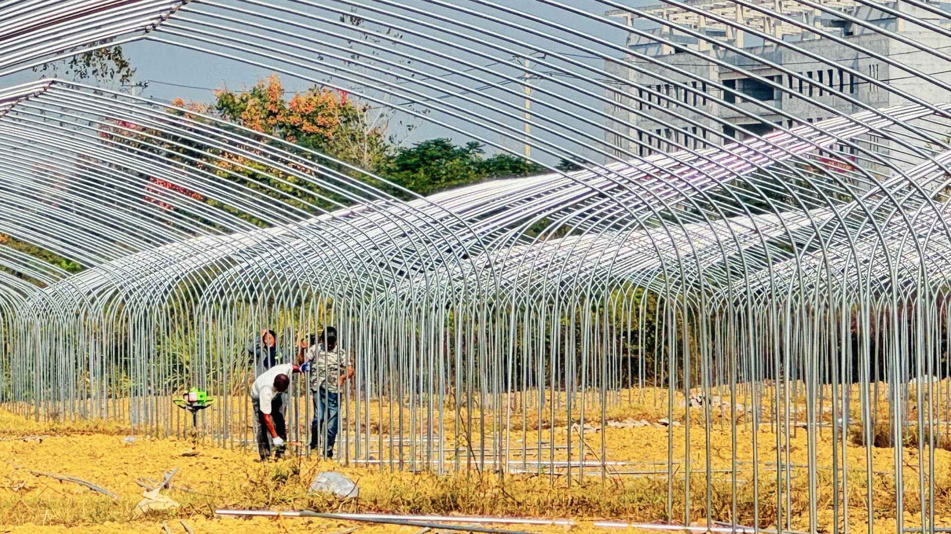 而在育苗基地对面几十米的不远处,一排排温室高效大棚拔地而起,工人们正在紧张有序地施工,争取要在幼苗移栽前完成所有大棚的建设工作,“我们共建设22个大棚,目前所有大棚的钢架主体机构基本完工,后面将陆续完成塑料薄膜的安装工程。”周俊指着不远处的大棚介绍到,“这些大棚除了要移栽蔬菜还将轮番种植大番茄、香瓜、油麦菜、圣女果、茄子、辣椒、阳光玫瑰和水果黄瓜等,争取成熟一批,采收一批,腾出一批,种下一批,22个大棚轮番种植,达到月月有收成的效果。”