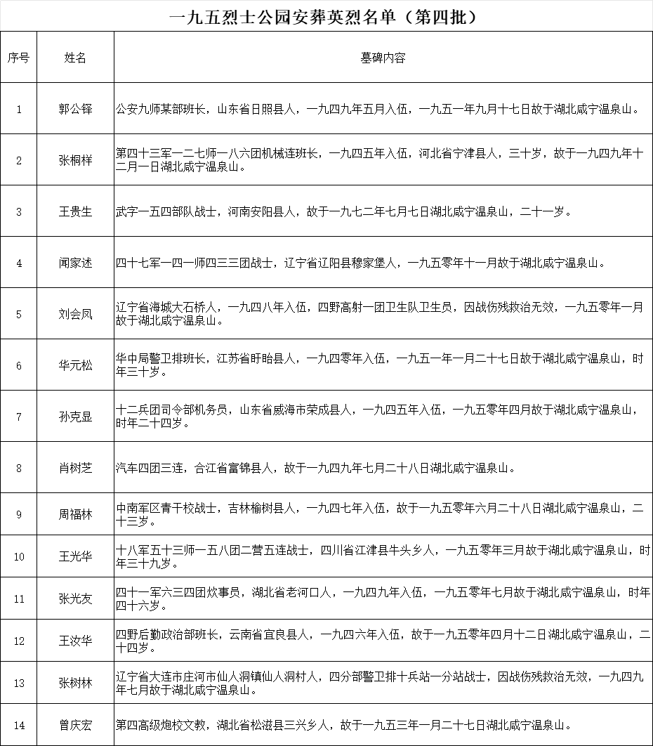附件:一九五烈士公园安葬英烈名单(第四批)