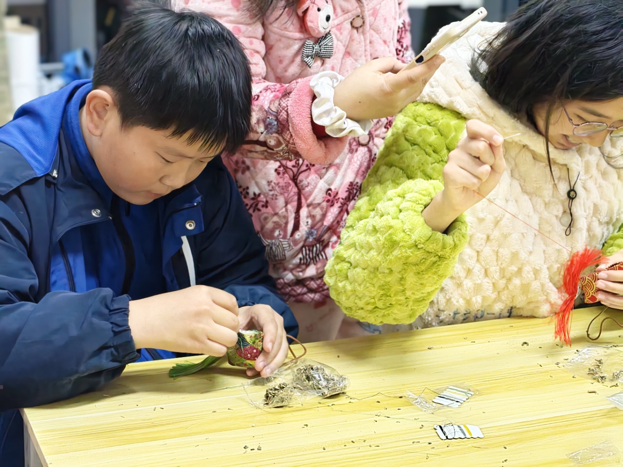 DIY香包制作环节最受大家欢迎。不同于简单的“缝一缝”,老师重点教学“藏针法”。孩子们握着针线专注学习,虽部分针脚偶有歪扭,却坚持“要像宋锦工艺那样整齐”;家长们一旁协助,还和孩子讨论“这个花纹配什么颜色的线好看”。当一个个内塞艾草、绣有简单纹样的DIY香包完成时,大家更在意“亲手制作”的意义,把手工的温度与乐趣变成可捧在手心、带在身边的“生活好物”。