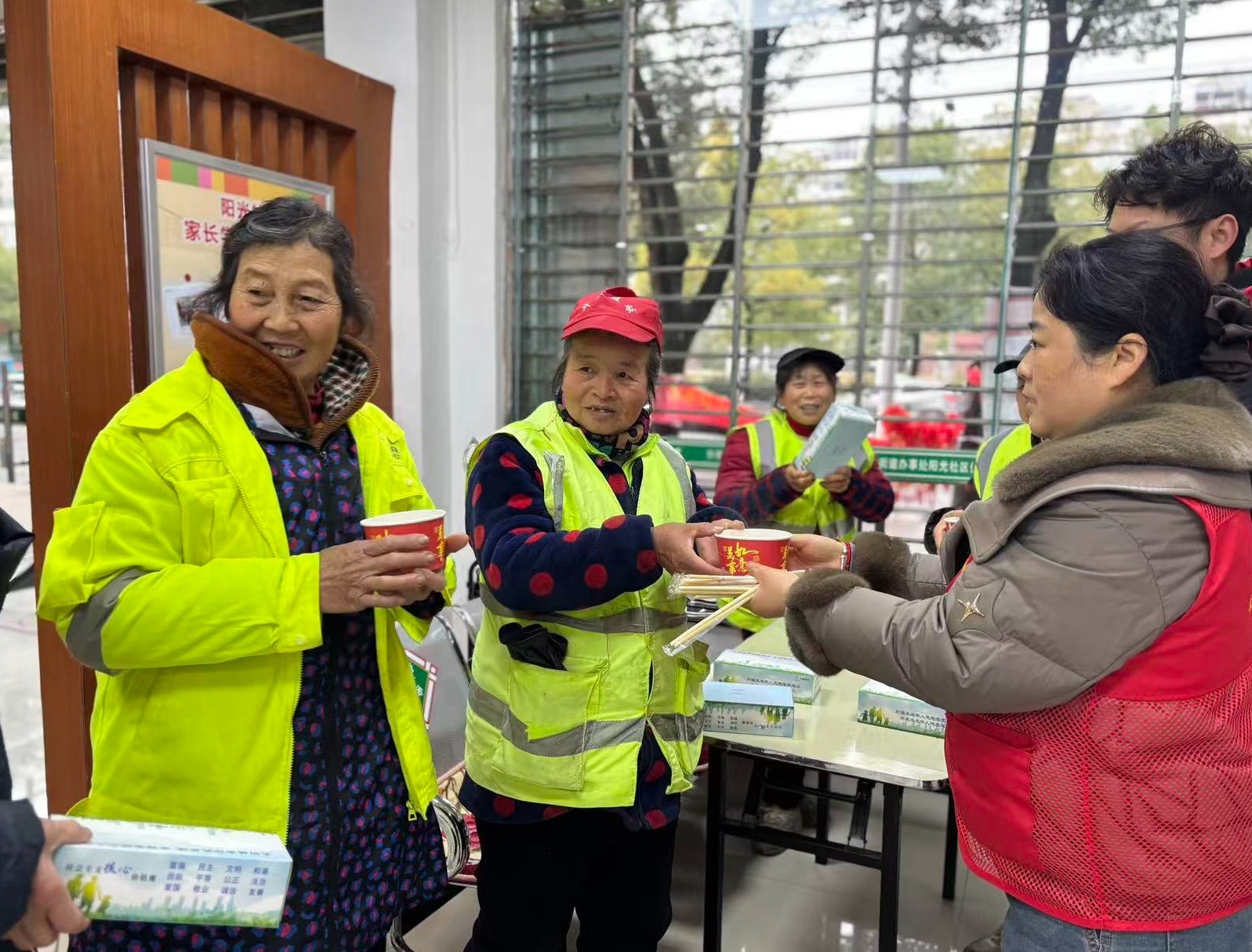 活动还邀请了新就业群体参与,让平日里忙碌的户外工作者也能感受到社区大家庭的温暖。活动尾声,社区工作人员与志愿者们化身“温暖使者”,将一碗碗满载关怀的元宵送到独居老人、环卫工人手中,与他们亲切交流,送上节日的问候与祝福,让这份温暖在社区中不断传递。