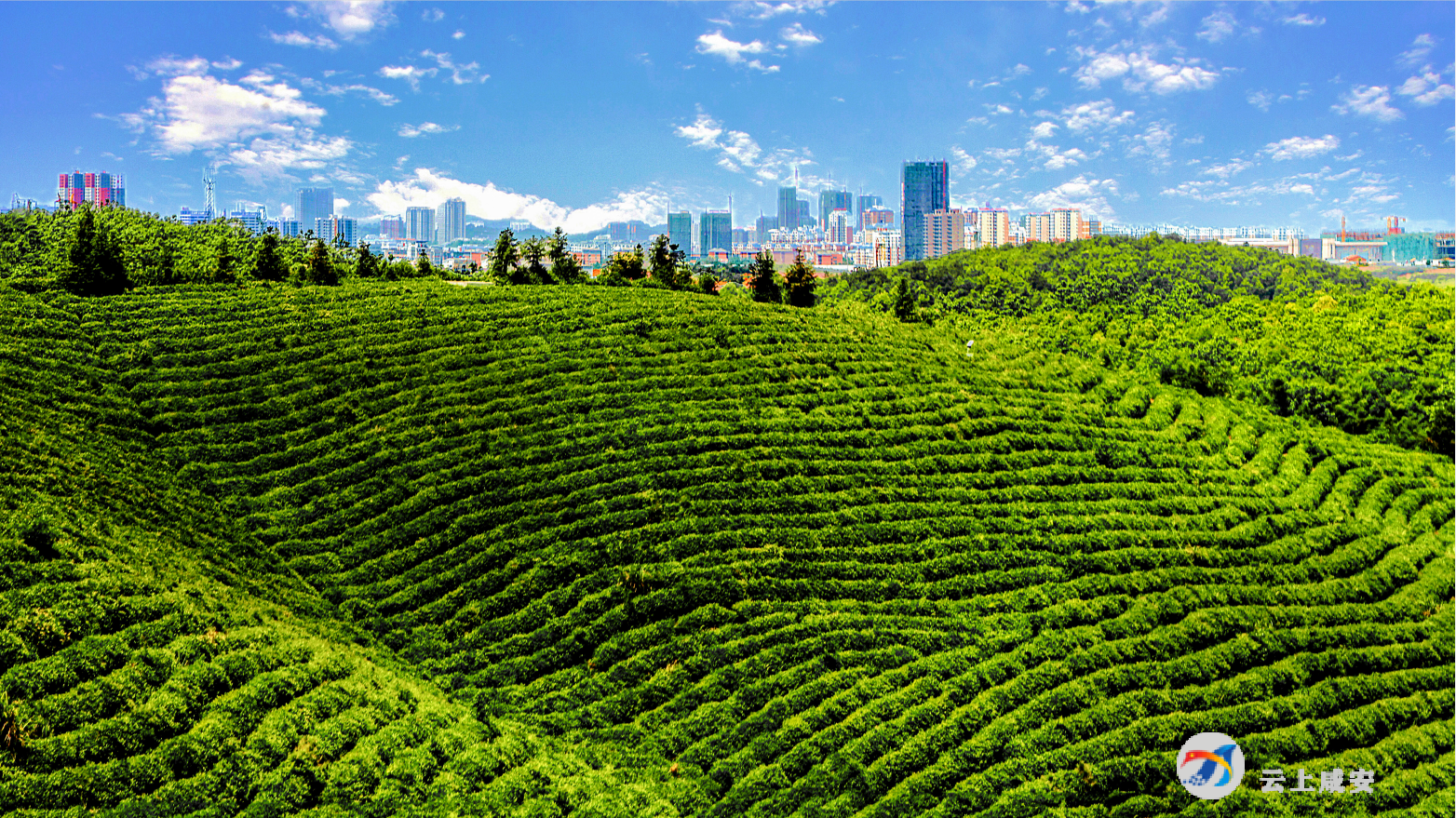 拍摄于黑山茶厂,茶园碧绿如染,清朗秀美,风情自然天成。远处城市高楼耸立,原生态的茶产业和现代化的建筑构造出一幅生机勃勃的美丽画卷。