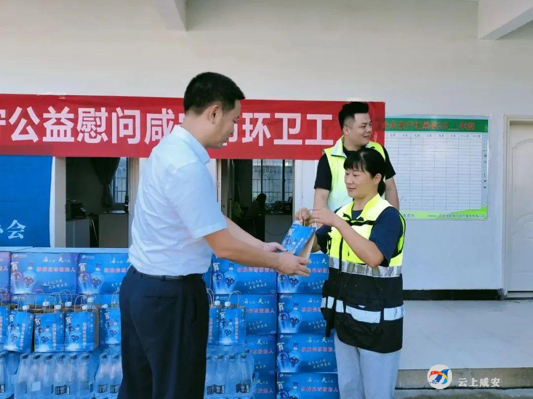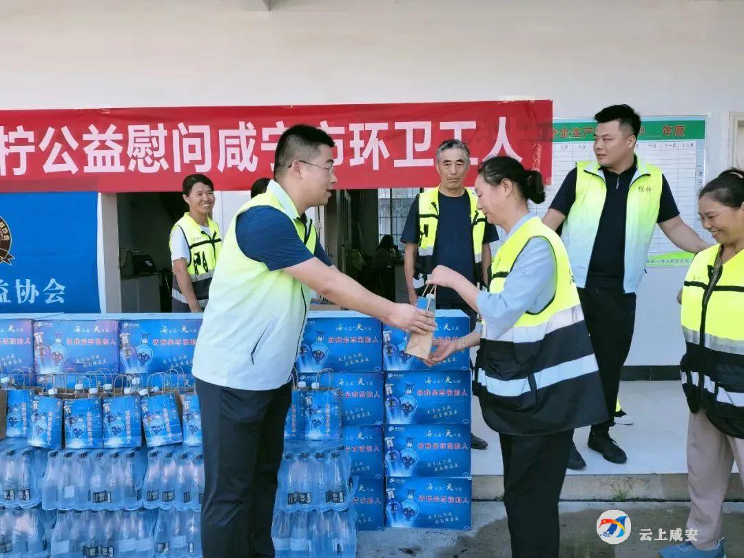 云上咸安报道 8月5日早上,咸宁洋河股份有限公司咸宁分公司携手团区委、青柠公益协会的志愿者开展“情系环卫工 盛夏送清凉”公益活动,为酷暑中坚守岗位的1200位环卫工人送上清凉物资。