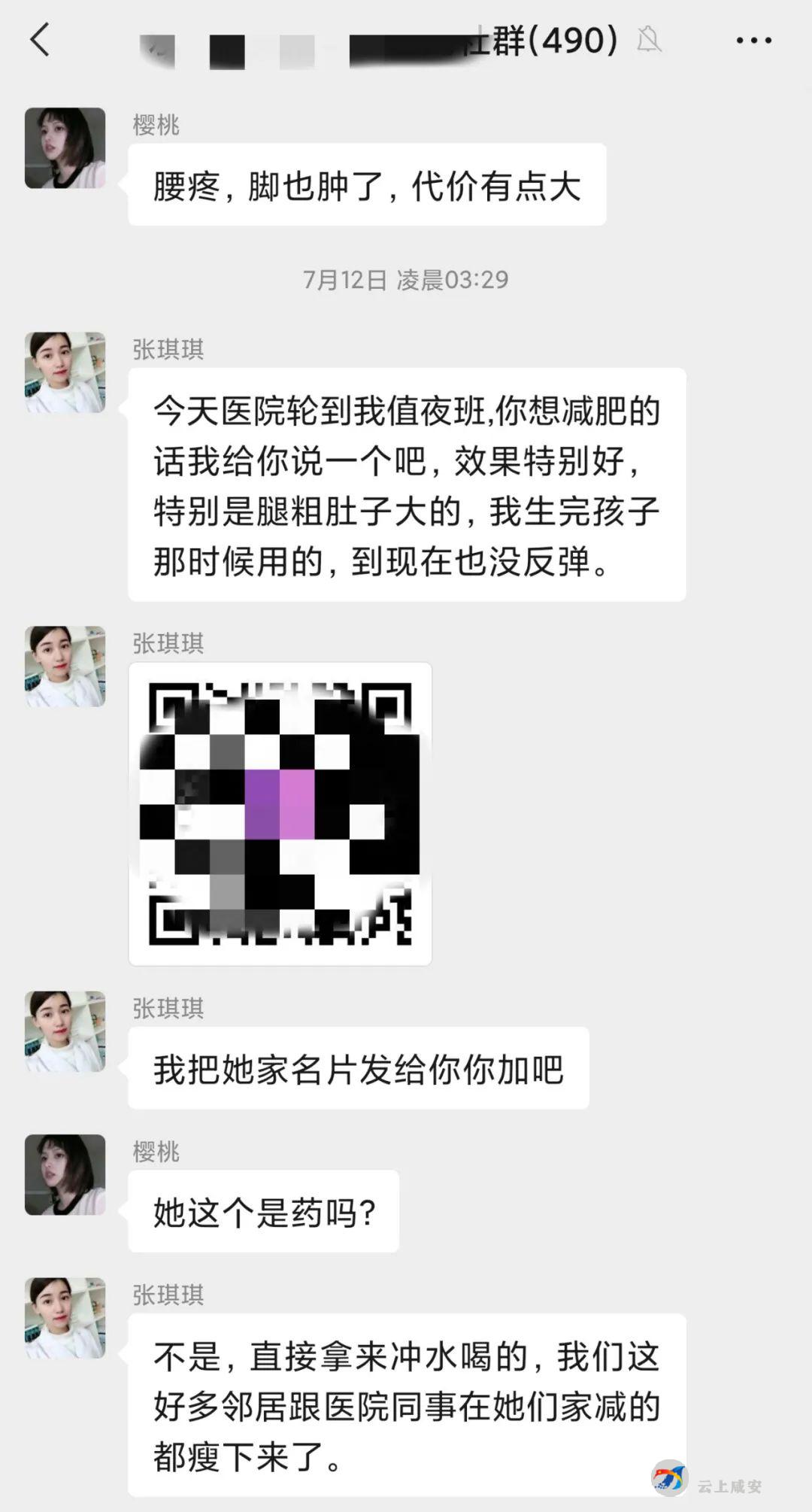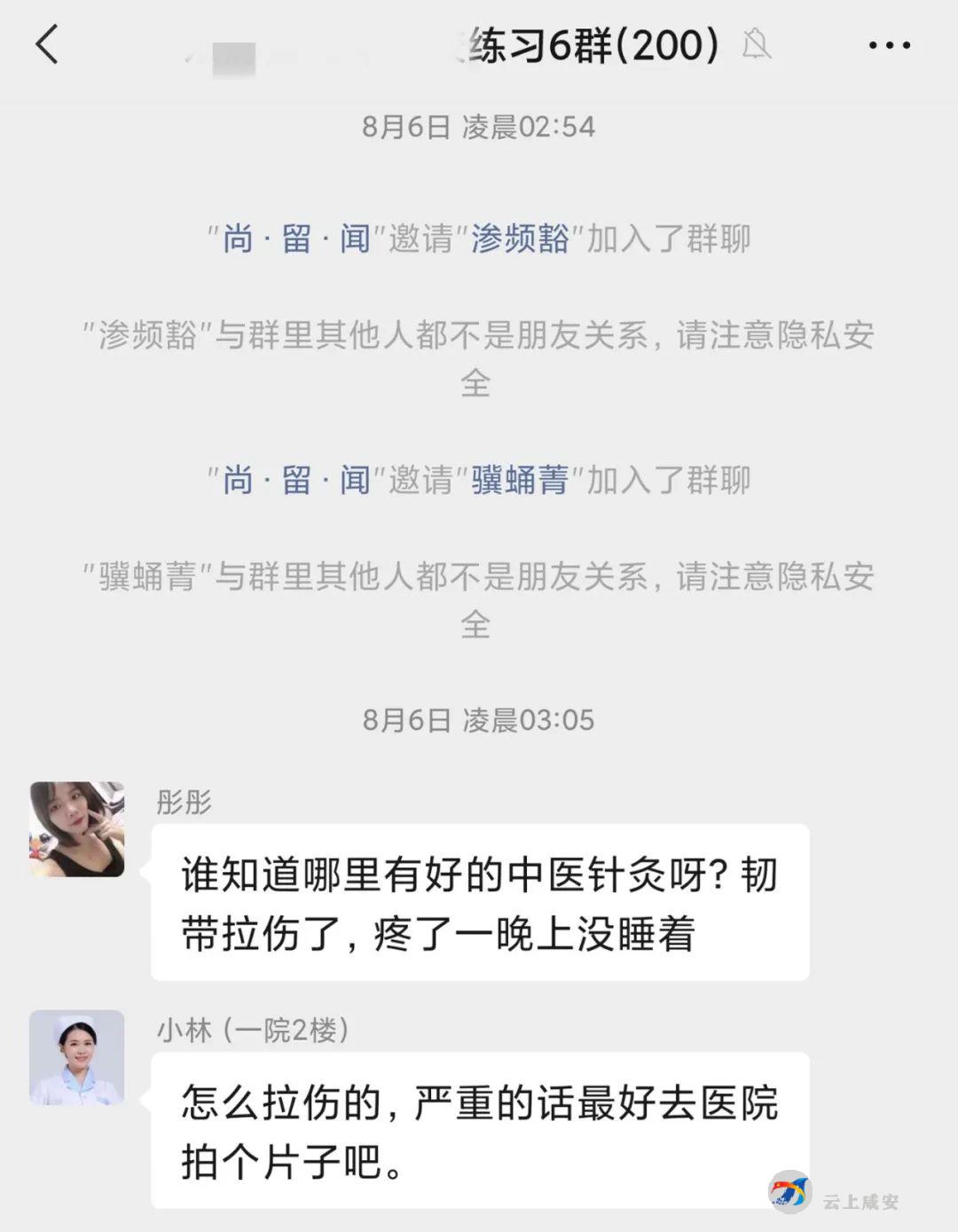 原来,拿“宸宸”手机将自己邀请进群聊的微信网友“尚·留·闻”在凌晨2点54分又邀请了两个微信网友进群,两人进群后将群聊昵称改为“彤彤”和“小林(一院2楼)”后开始一唱一和演起了“双簧”。“彤彤”称自己为了减肥练瑜伽不小心将韧带拉伤了,请群友推荐好的中医针灸,而“小林(一院2楼)”则假装医院的护士,趁机推销起了减肥药,还附带二维码。其他群聊截图