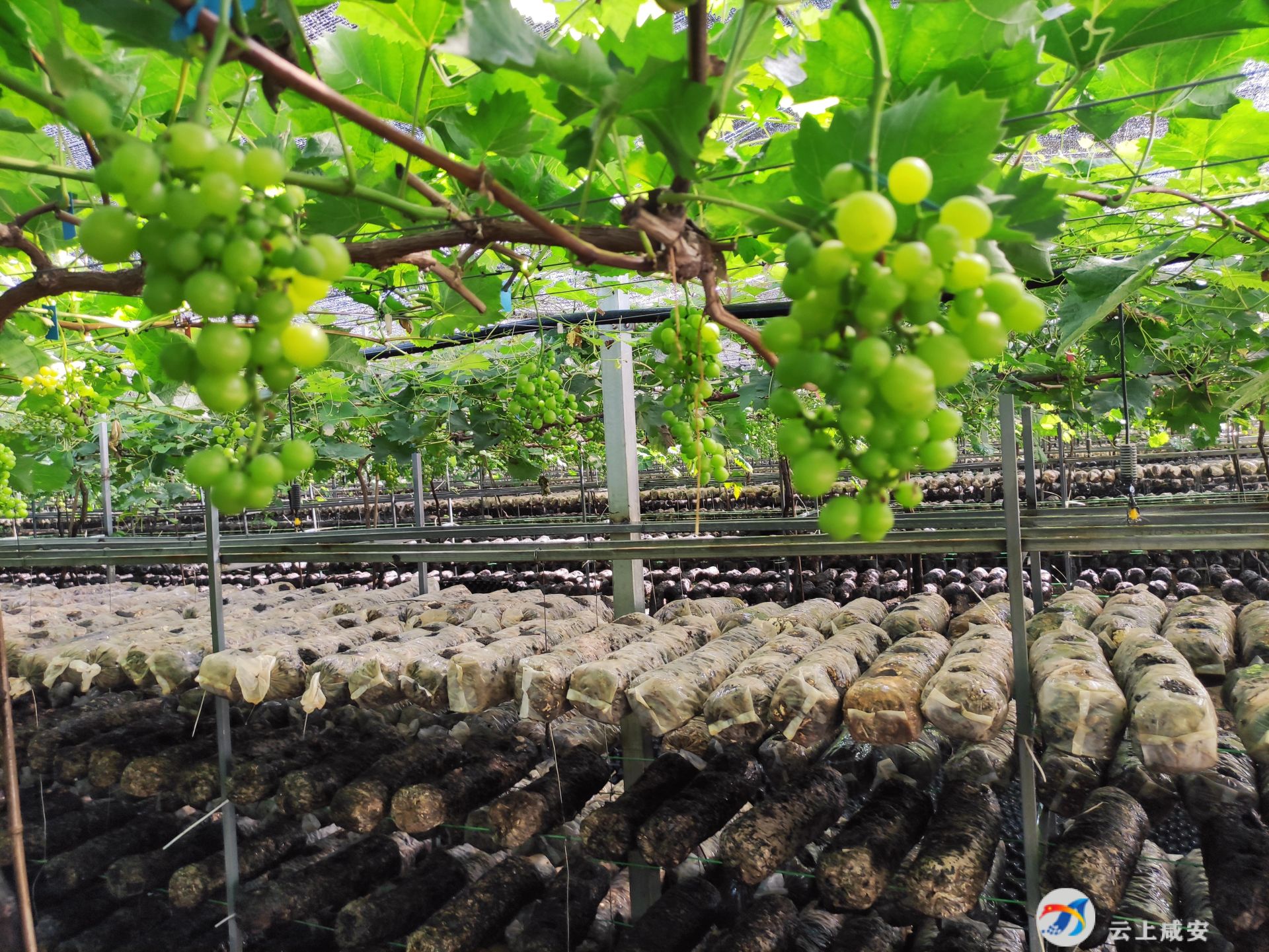 记者在现场看到,“阳光玫瑰”大棚底下还整整齐齐摆放着一层层的菌棒,果园董事长杨子元一语道破了商机。“这就是我们合作社新探索试验的 ‘葡萄架下种香菇’试点,专门用了1个大棚进行花菇、‘阳光玫瑰’葡萄共种。”杨子元告诉记者,这样有利于提高种植效益,除外还有4个大棚进行了菌棒种植,今年总共产出50万棒菌棒,附近乡镇以及周边村民都过来采购菌棒,已经出售了14万棒菌棒,不少群众通过种植花菇增收致富,因花菇营养价值高,销路不愁,一年四季都供不应求。