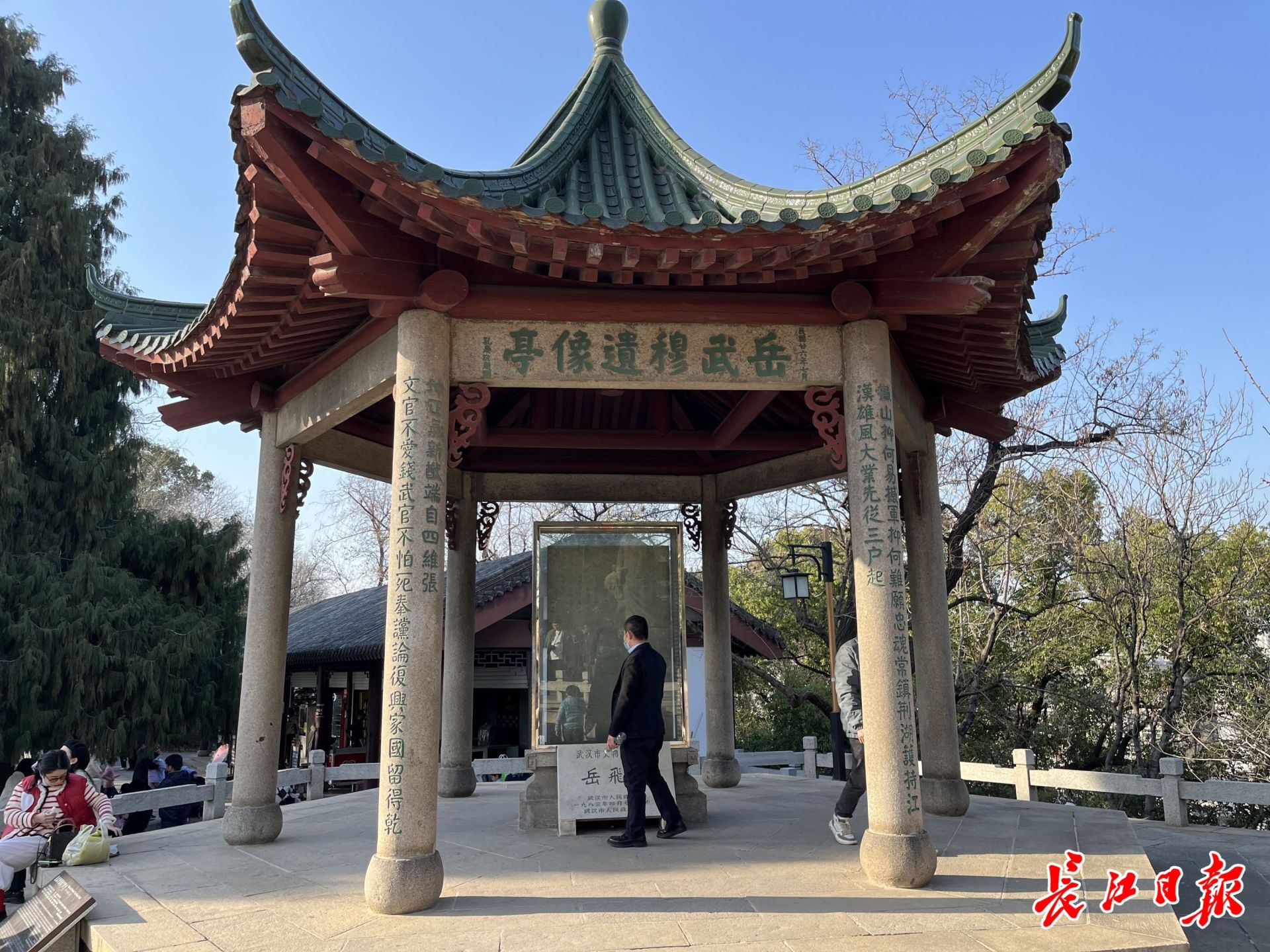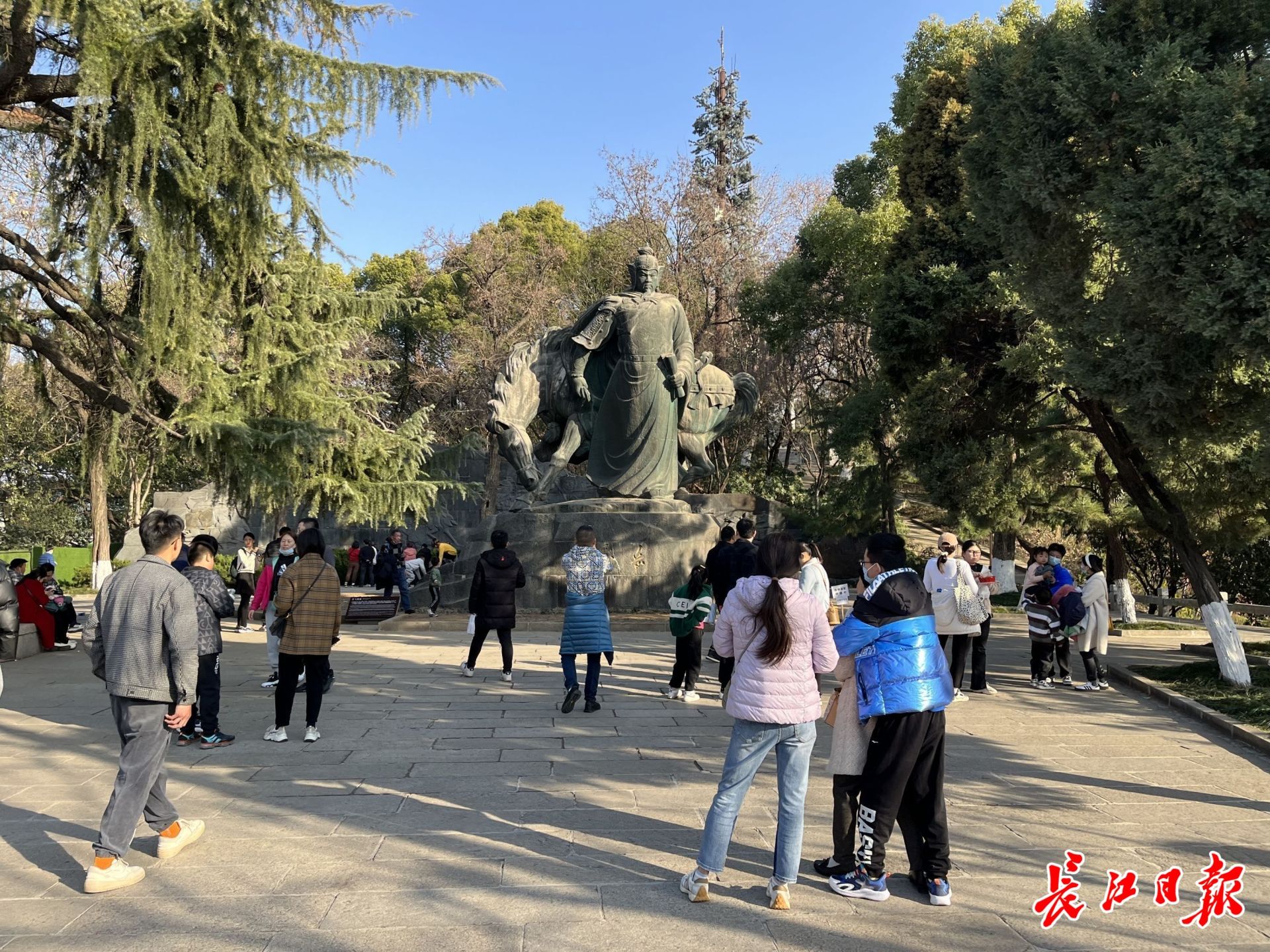 1月30日(正月初九)下午,黄鹤楼公园人流如织。在公园内的岳飞广场,大批市民和外地游客在岳飞铜像前拍照,不少游客在岳飞亭内仔细端详石刻岳飞遗像。春节来汉旅游的一家三口告诉记者,他们春节来汉旅游,看过电影《满江红》后,下午专程找到黄鹤楼公园的岳飞广场,以此缅怀爱国英雄岳飞。