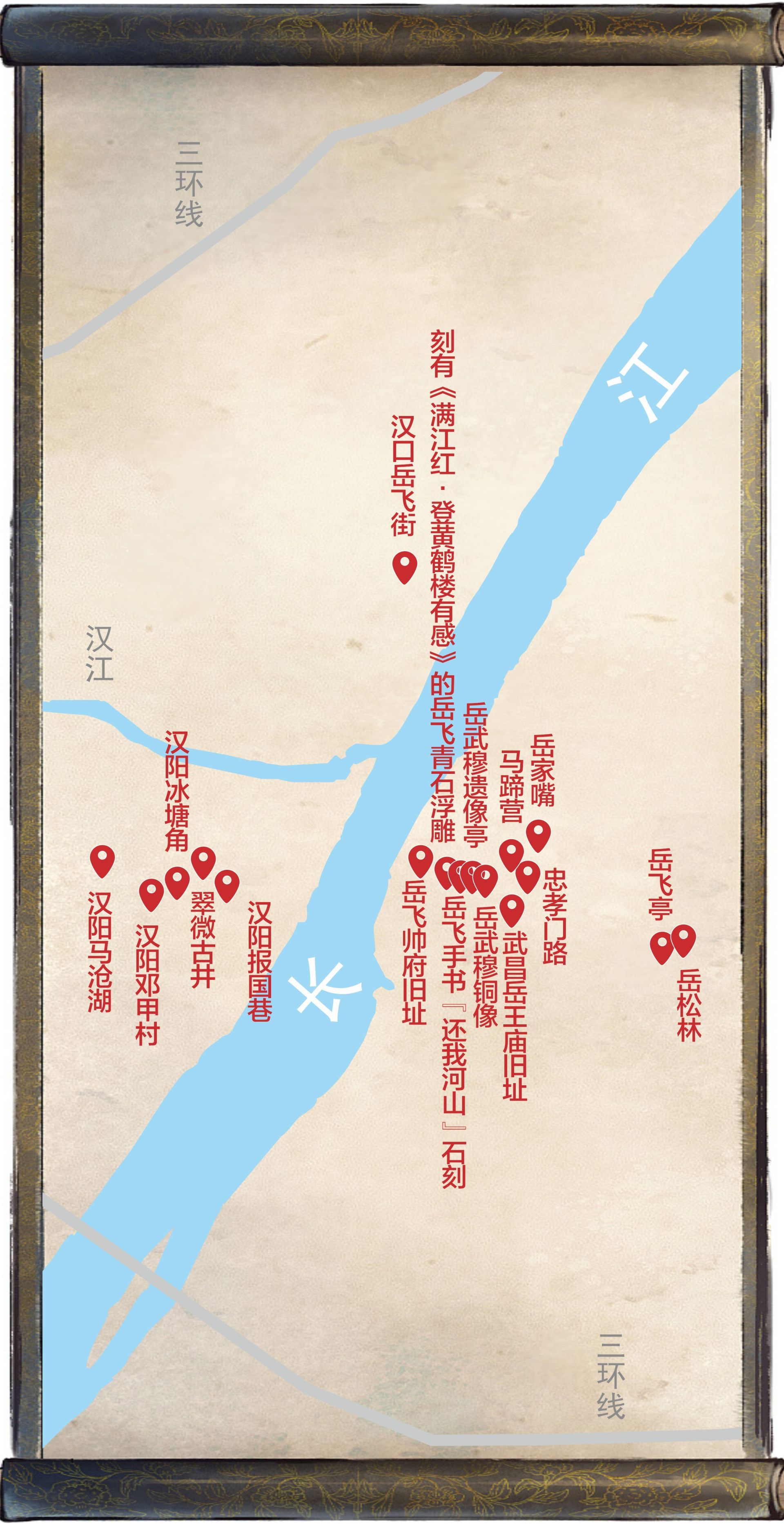 今天,有关岳飞的遗迹除了武昌蛇山上的武穆遗像,还有岳家军操练水军处的岳家嘴、今司门口九通商厦处的岳飞帅府、忠孝门、武昌岳王庙、汉口岳飞街、洪山的岳松岳梅,汉阳的报国寺、报国庵、冰糖角、马沧湖、屯甲村等,均与岳飞有关。