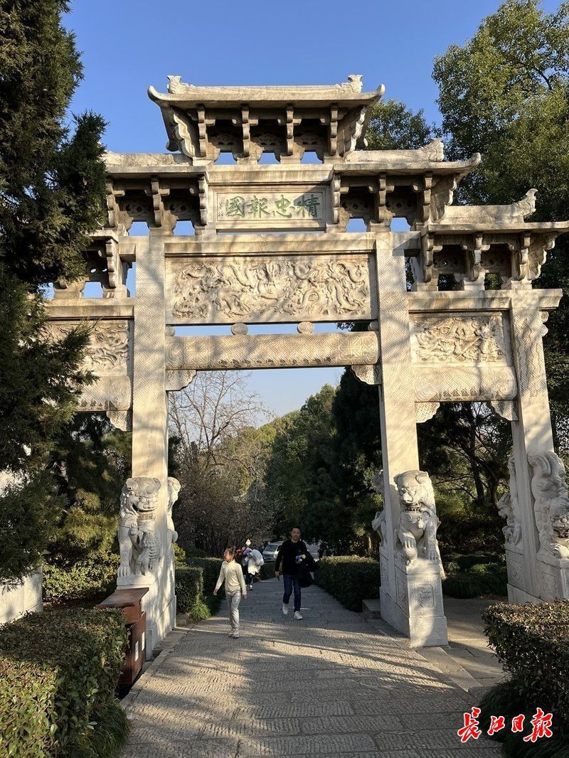 1月30日下午,记者在蛇山顶,黄鹤楼东边,穿过一组“四季牌坊”,看到最为高大宏伟的岳飞功德坊。牌坊的西、东横额上分别是当代书画家书写的“精忠报国”“功业千秋”。