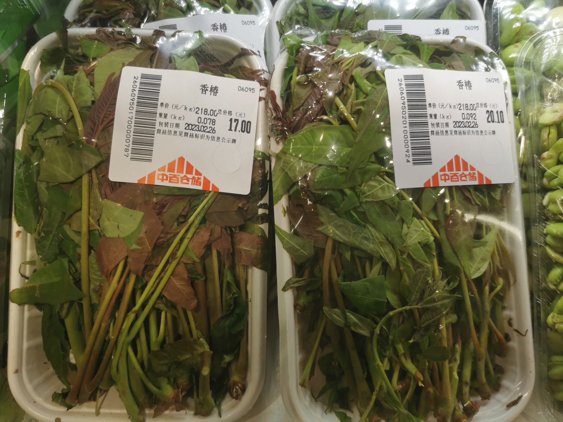 在咸宁某商超,记者发现了香椿售价高达109元/斤,一盒92克的香椿售价20元。“现在上市也是想让市民尝个鲜,一旦天气转暖,香椿越长越大,市场就会‘一天一价’。按照往年的经验,3月上旬价格会出现大幅度回落,市民也将实现‘香椿自由’。” 超市蔬菜专区工作人员介绍道。