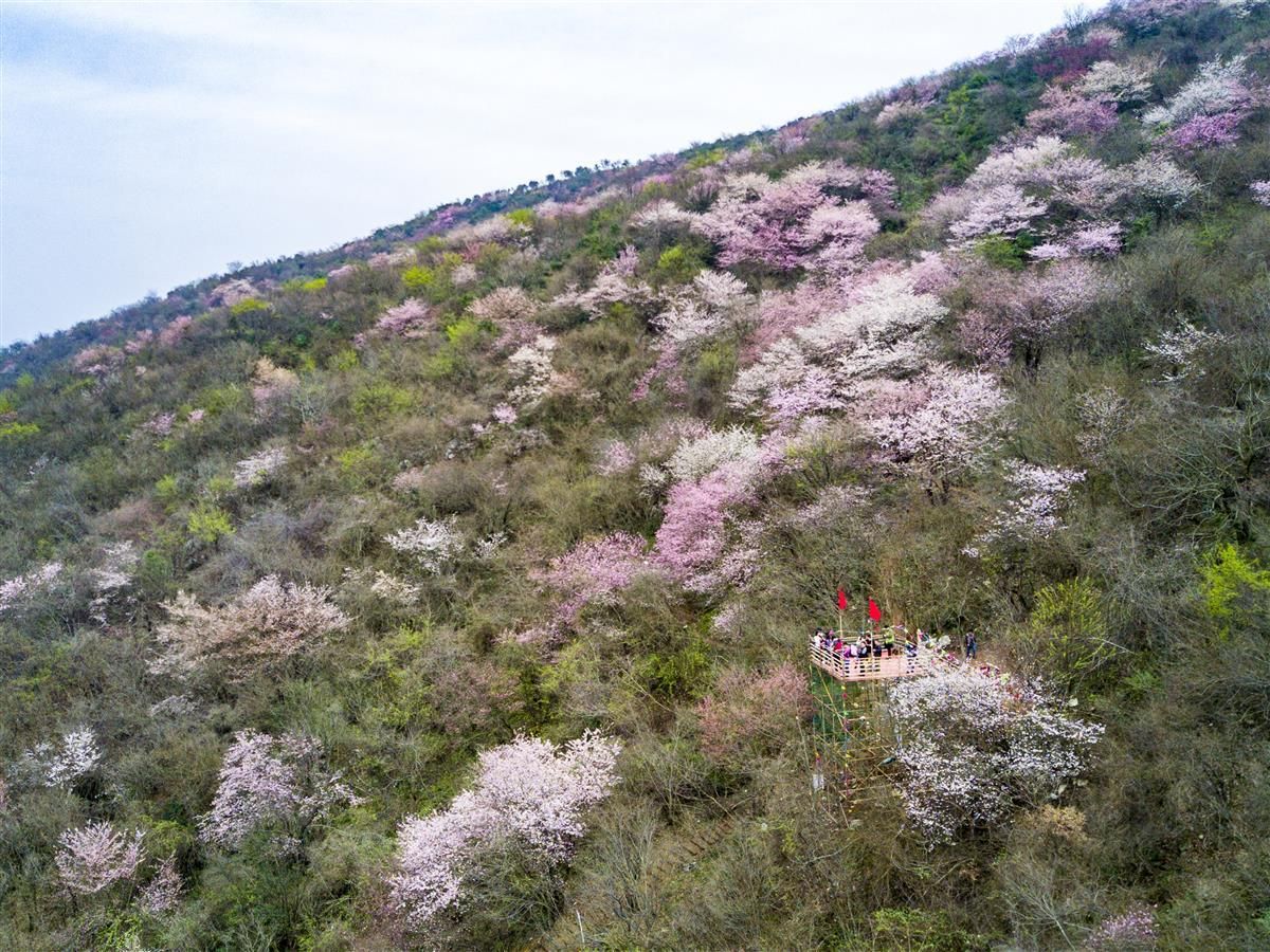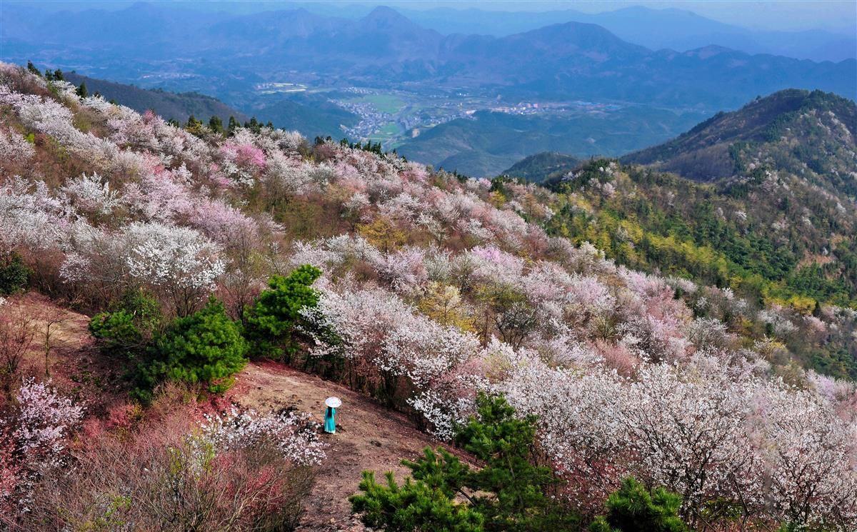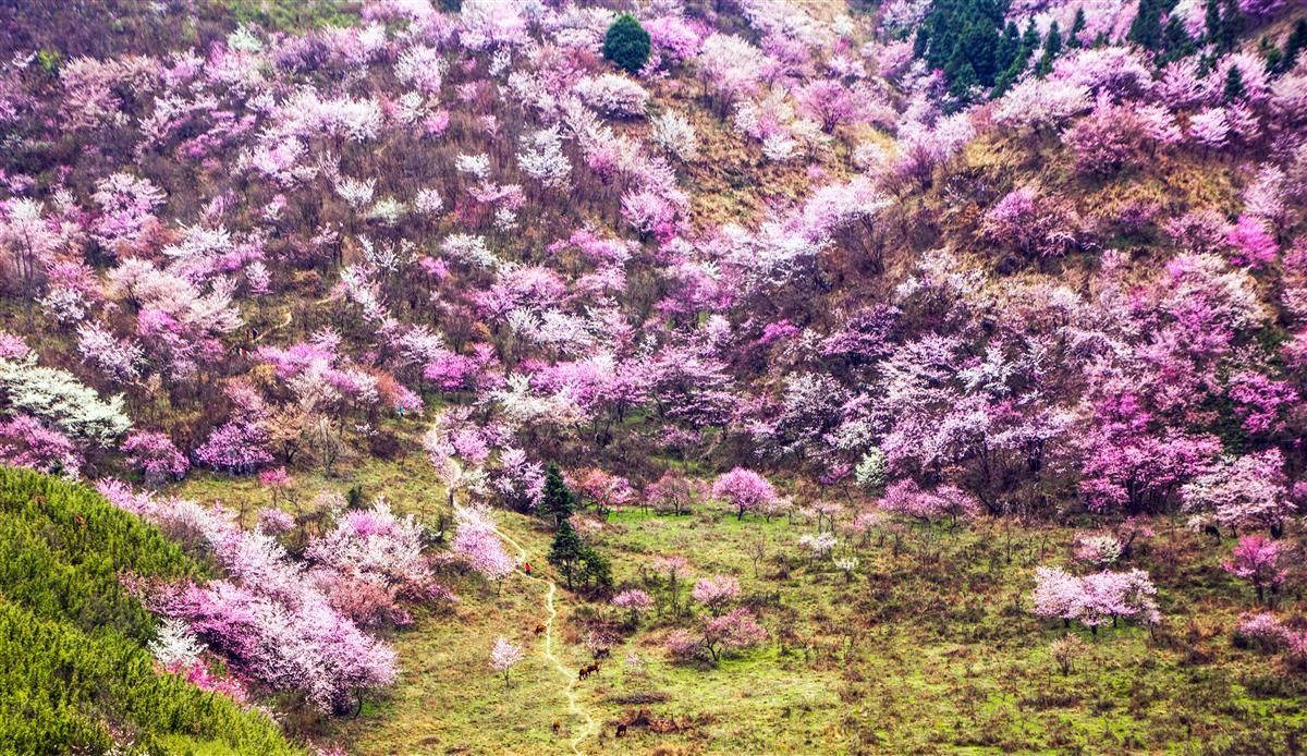大幕乡万亩野樱,学名叫“山樱花”,俗称“野樱花”“古樱花”,先开花后长叶,极具观赏和研究价值,一般花期为3月到4月中下旬。大幕山区野樱花树现存近万株,大的有2尺围,树龄有五、六十年,大幕山野樱花群落数量之多、分布之密集,实属罕见。