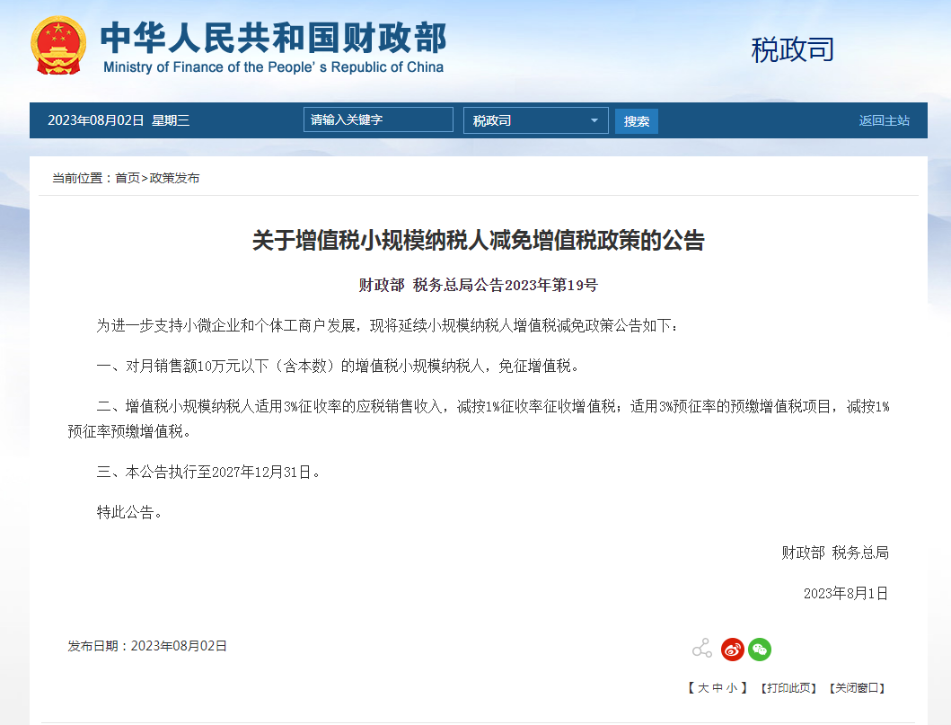 据财政部网站8月2日消息,财政部、税务总局发布《关于增值税小规模纳税人减免增值税政策的公告》,为进一步支持小微企业和个体工商户发展,将延续小规模纳税人增值税减免政策。 公告如下: 对月销售额10万元以下(含本数)的增值税小规模纳税人,免征增值税。 增值税小规模纳税人适用3%征收率的应税销售收入,减按1%征收率征收增值税;适用3%预征率的预缴增值税项目,减按1%预征率预缴增值税。 本公告执行至2027年12月31日。 (来源:湖北发布、财政部网站、中国经济网 编辑:方焱)