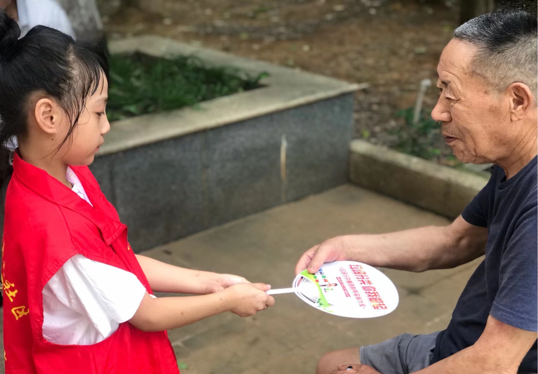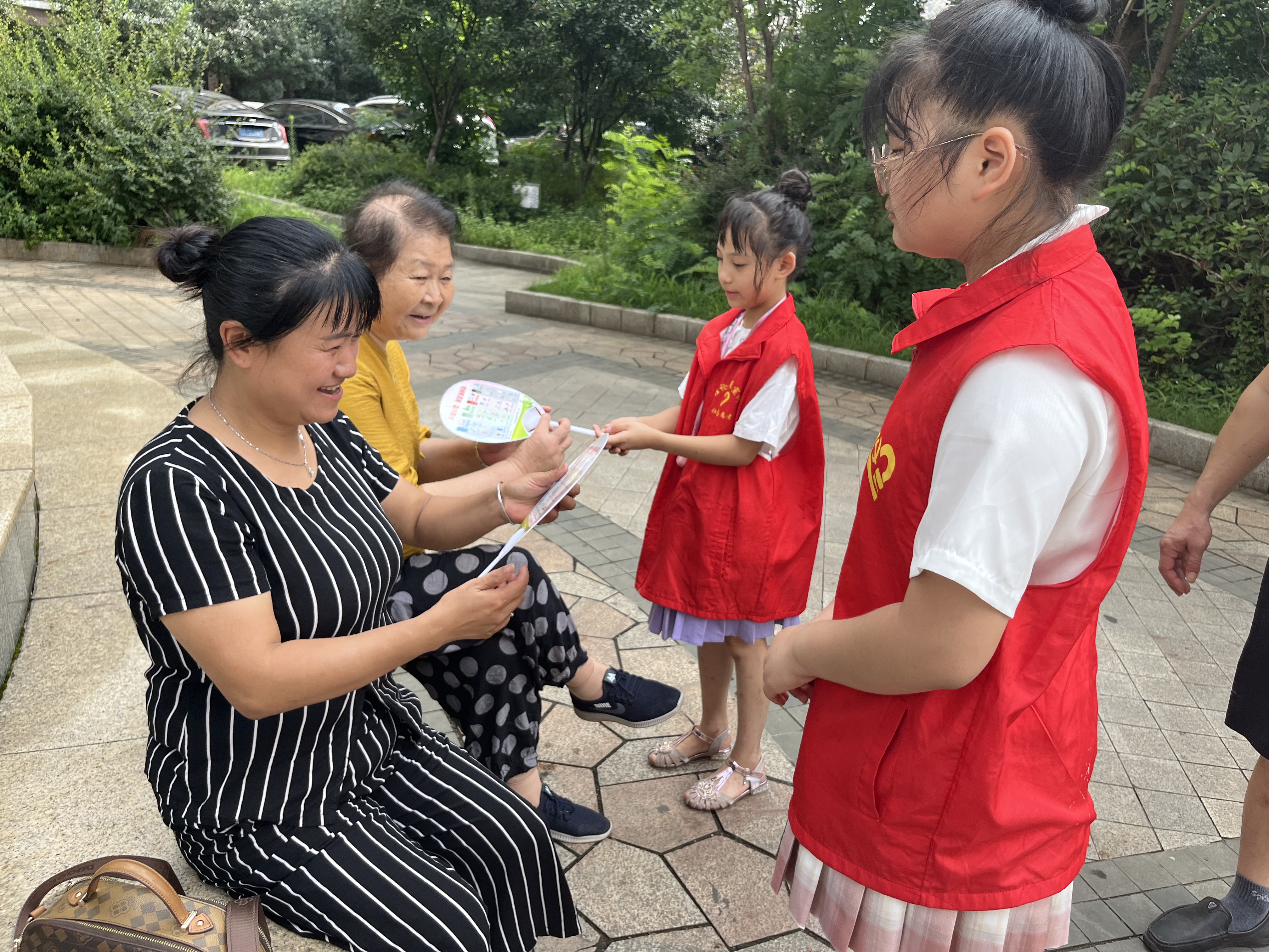 “爷爷、奶奶,天气炎热,送给您一把扇子,这个上面有垃圾分类的知识,可以卖钱的是可回收的垃圾,废电池类的是有害垃圾……”身穿红马甲的小小“幸福合伙人”在小区热情地向居民递上一把清凉“扇”,向大家宣传垃圾分类知识,倡导垃圾分类从我做起。
