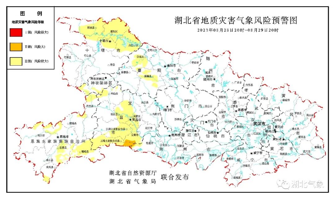 2023年8月28日20时—8月29日20时,因前期累计降水强度较大,预计三峡库区(巴东北部、兴山北部、秭归东部、夷陵),神农架林区西部、十堰(十堰市城区、郧西中部和东部、郧阳、丹江口)、襄阳(谷城、南漳北部和中部)、宜昌(宜昌市城区、长阳、五峰、宜都)、恩施(恩施市北部局部、建始东北部、利川东北部、来凤南部、宣恩、鹤峰)、荆州(松滋西部)以及其他强降水区域发生崩塌、滑坡、泥石流的风险较大;其中,宜昌(五峰东部、宜都南部)、荆州(松滋西部局部)发生崩塌、滑坡、泥石流的风险大。