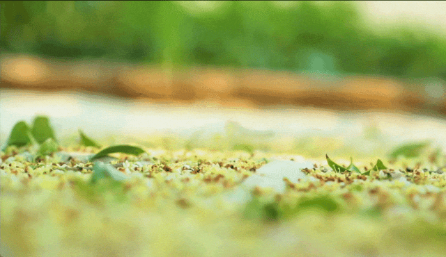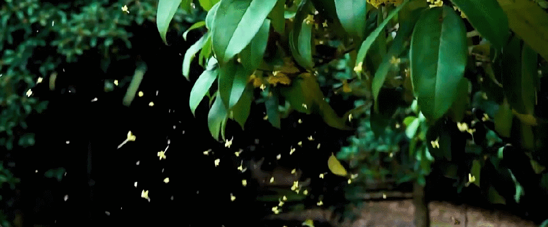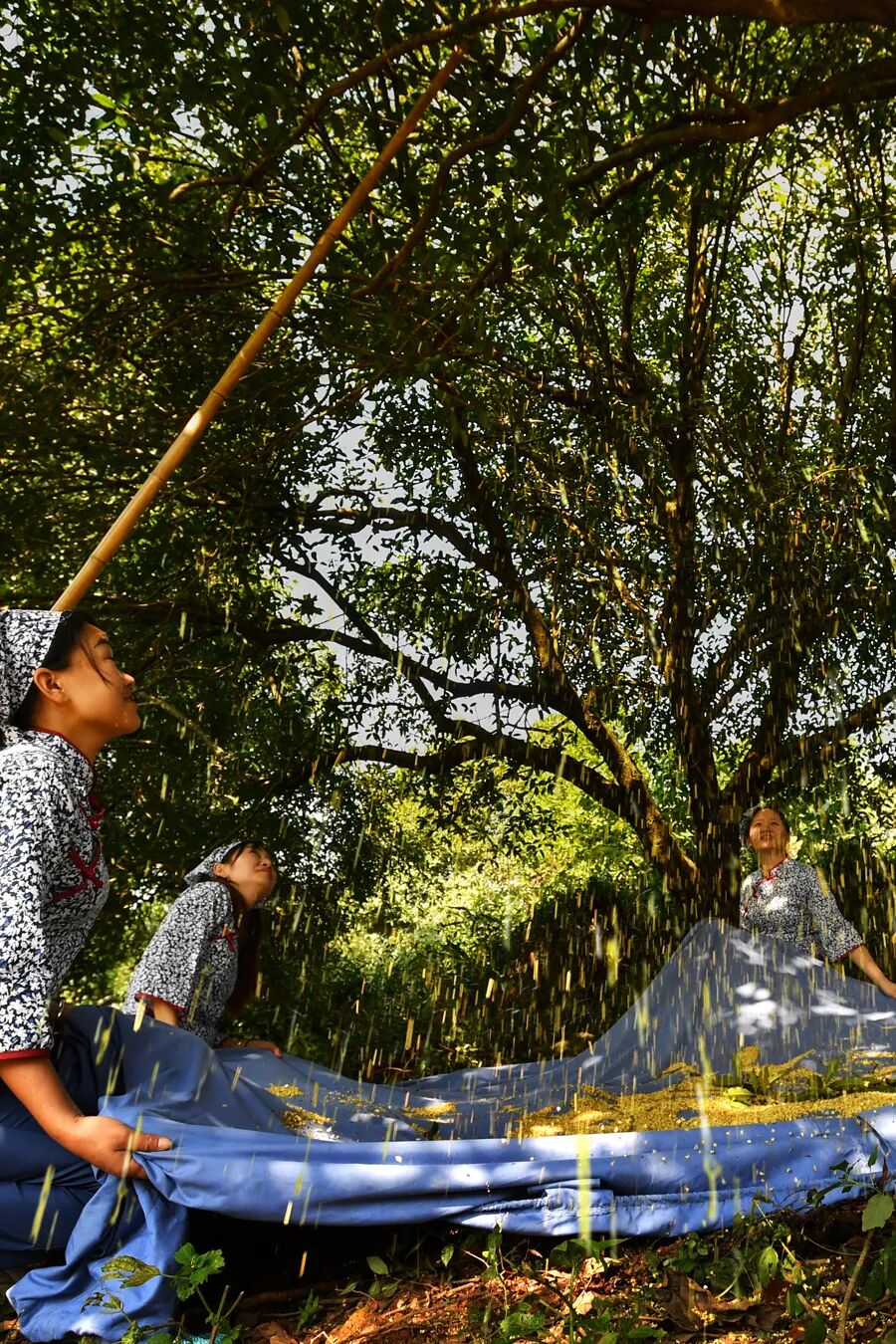 用两根竹竿撑开一块巨大的棉布,铺于桂花树下,雷武东手持长竹竿,轻敲枝头,桂花便像落雨一般,从空中撒下来。