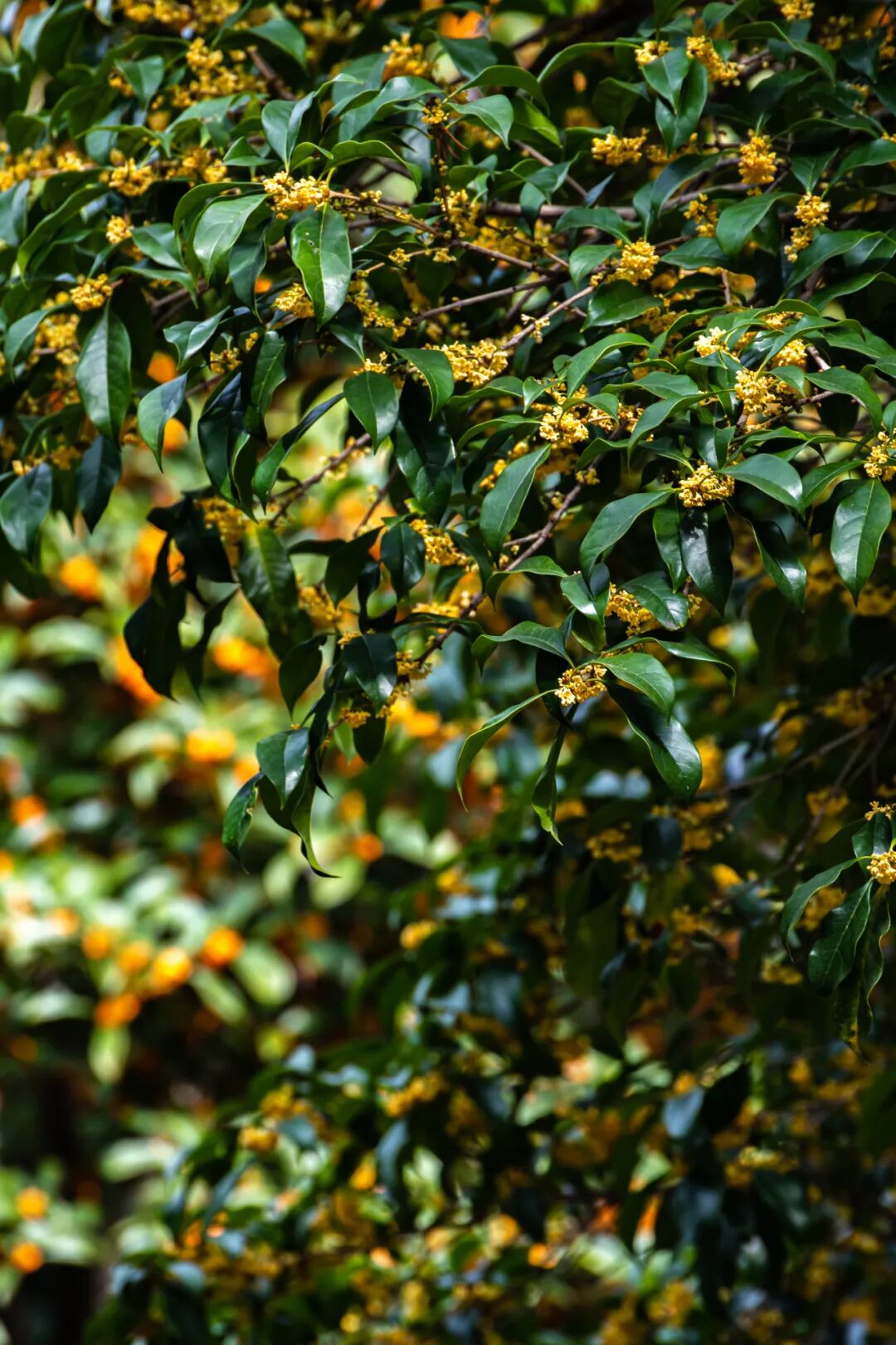 金桂,顾名思义,其花朵颜色为深浅不一的金黄色系,香味浓郁,其叶片大而长,花朵生长密集,轻轻一碰就会从树上脱落;