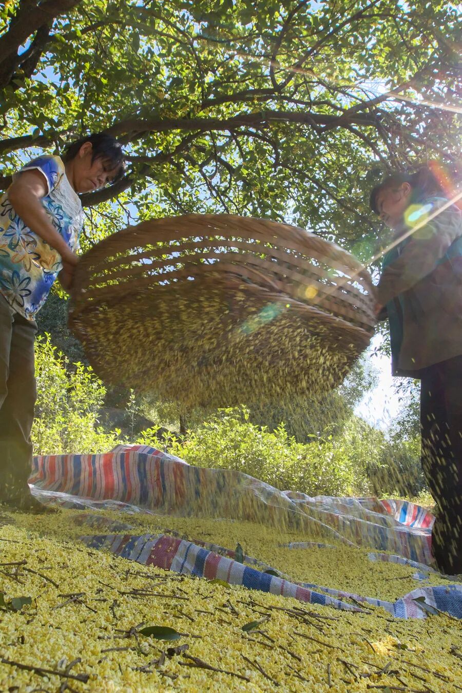 打桂花时,许多叶子也一同落下,便要用有小孔的簸箕把桂花筛出来,带回家后,再将桂花摊开,阴干,等待使用。