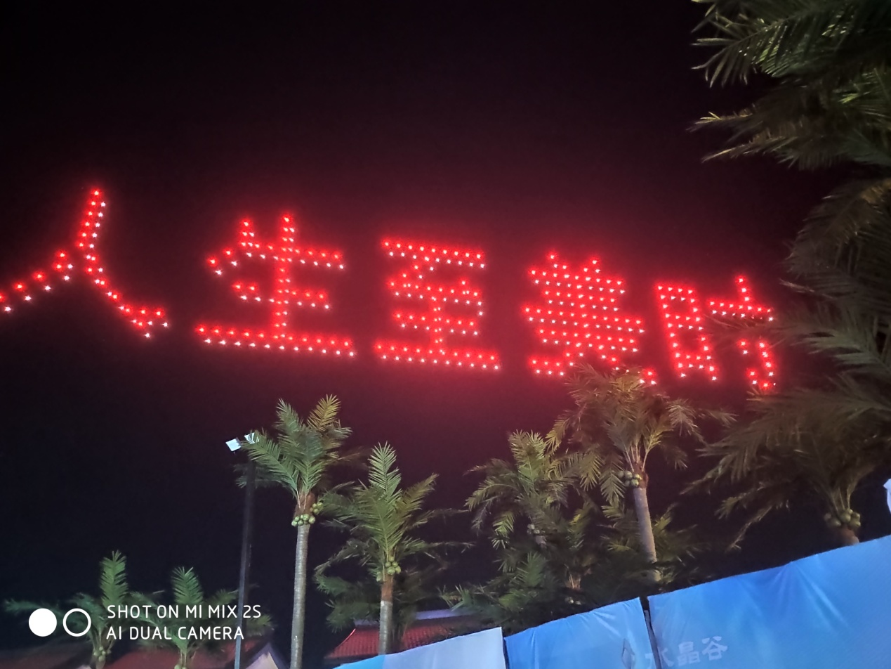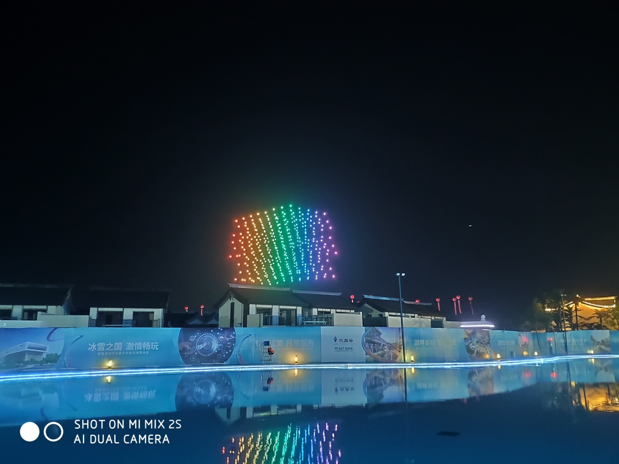 一场新潮的表演颠覆视觉:400架无人机首秀咸宁,打造流光溢彩的光影盛宴。在指挥下编队飞行,在广场震撼舞蹈,变换出各种复杂队形,于星空摆出“人生至美时”、“新兴际华”“入住水晶谷”等字样,空中舞动的音符与台上的动感音乐交互辉映,营造空前壮观的视觉效果。
