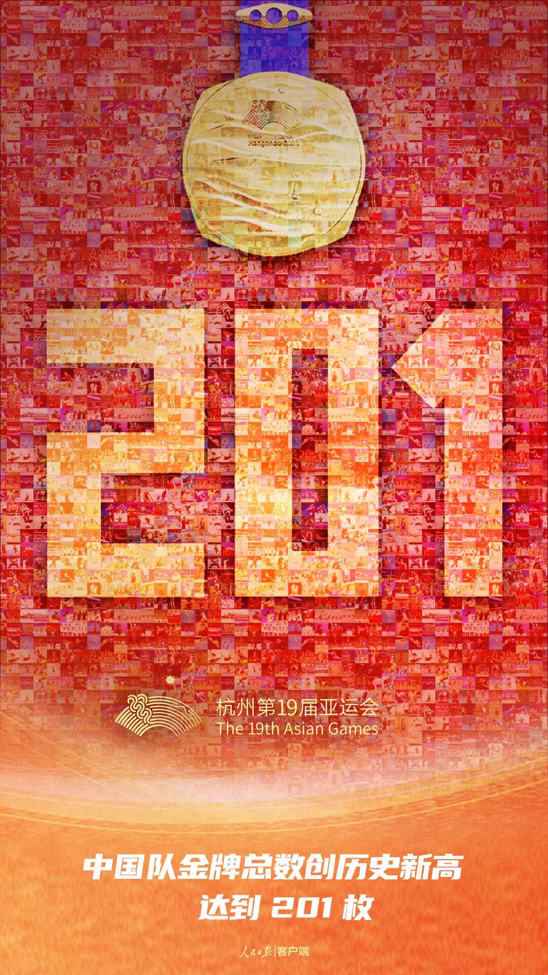 10月8日中午,杭州亚运会所有项目完赛。中国体育代表团获得201金111银71铜,共383枚奖牌,取得亚运会参赛历史最好成绩。自1982年第九届亚运会以来,中国体育代表团连续第十一次位居亚运会金牌榜榜首。 本届亚运会,中国代表团3次刷新世界纪录、18次刷新亚洲纪录、74次刷新赛会纪录。让我们一起为体育健儿顽强拼搏、奋勇争先的精神喝彩! 恭喜中国体育代表团! (来源:人民日报 编辑:董盈)