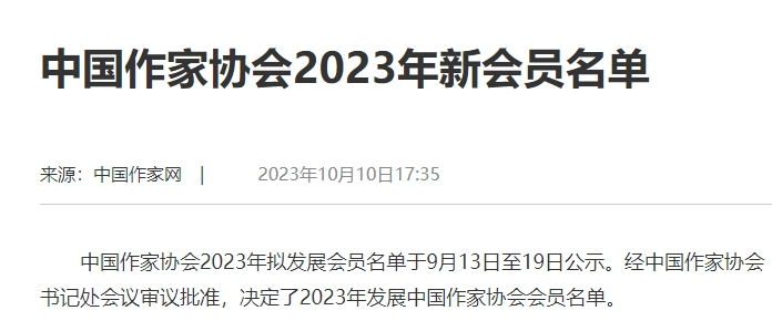 10月10日,从中国作家网发布的“中国作家协会2023年新会员名单”中获悉,咸宁作家成丽新晋中国作协会员。