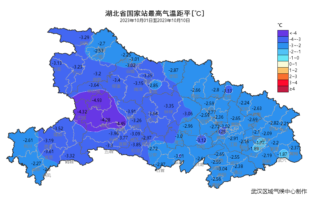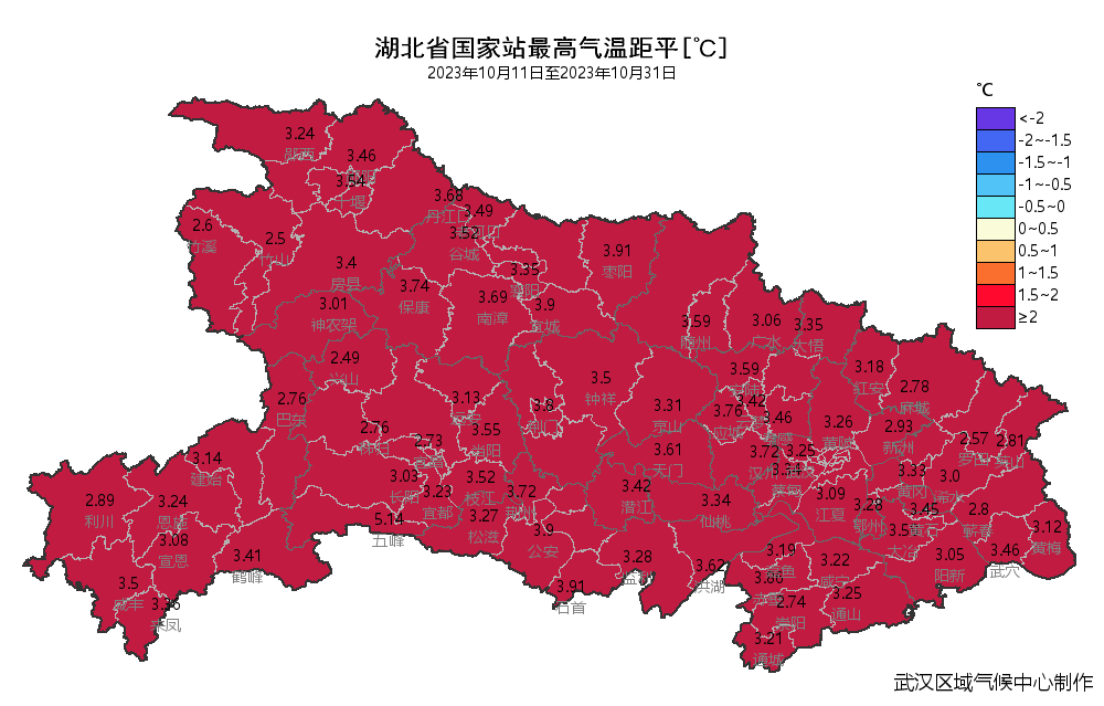 刚刚过去的10月,我省气温和降水分别出现时空两极分化的局面,气温前低后高,降水西多东少。10月上旬全省平均气温较历史同期偏低1℃,宜昌、荆门等地偏低2℃多,而到了10月中下旬省内大部地区的平均气温都比常年显著偏高2℃左右,排历史同期第四位,全省平均最高气温更是异常偏高3℃多,位居历史同期第二高位。