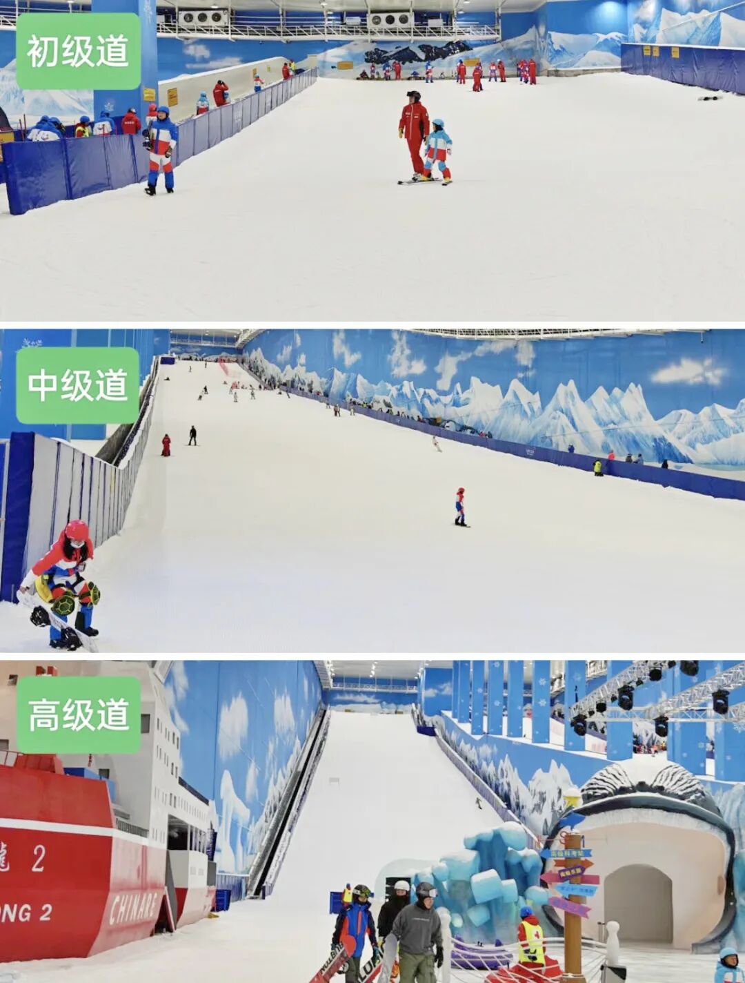 滑雪馆内主要分为四大区域,分别是初级滑雪道、中级滑雪道、高级滑雪道和娱雪区,不管你的菜鸟小白,还是专业大师级选手,统统可以在里面找到自己心仪的玩耍场地。