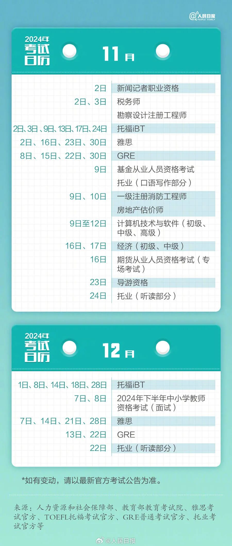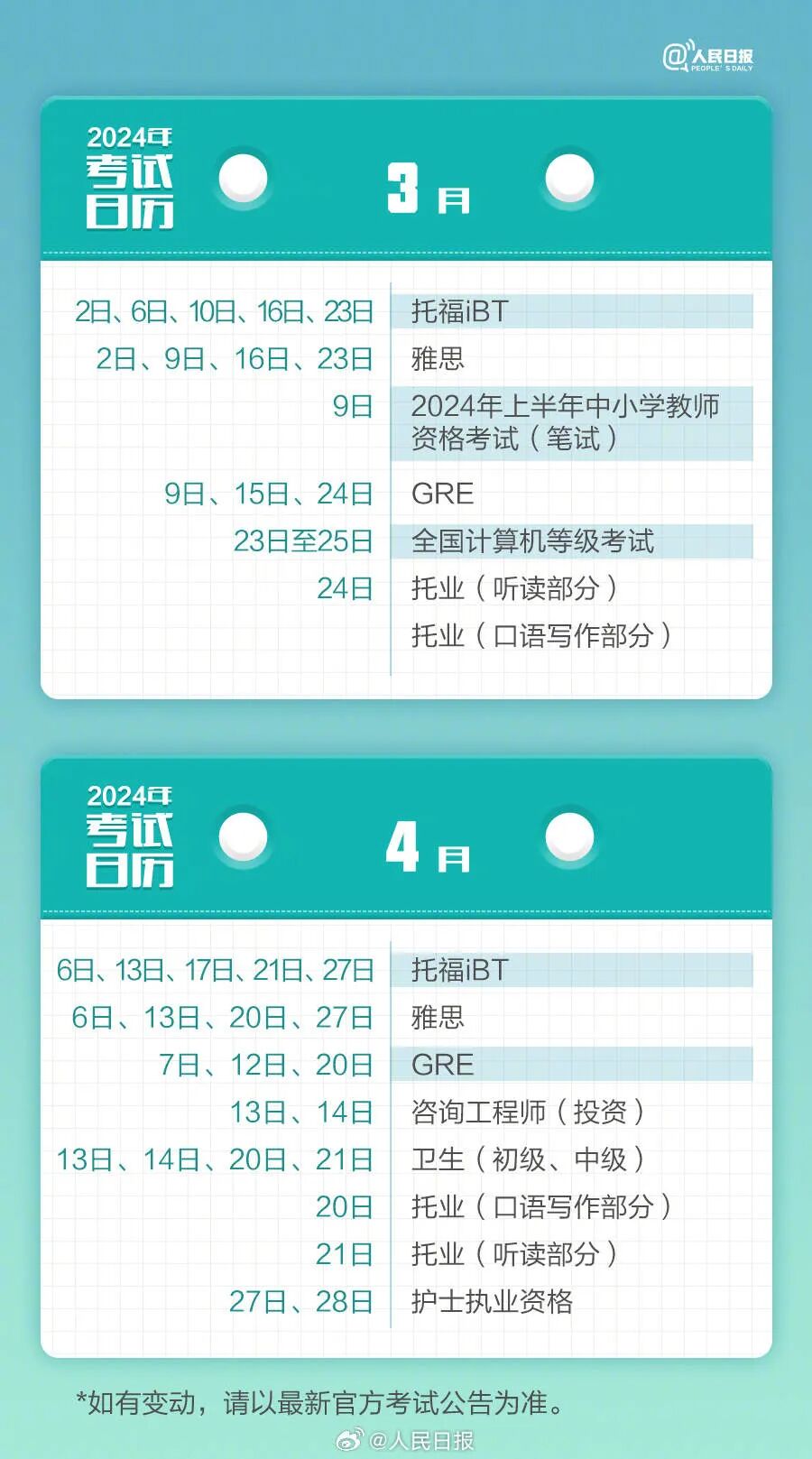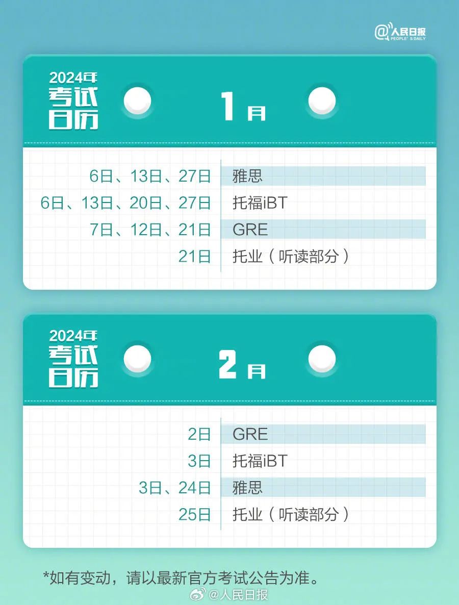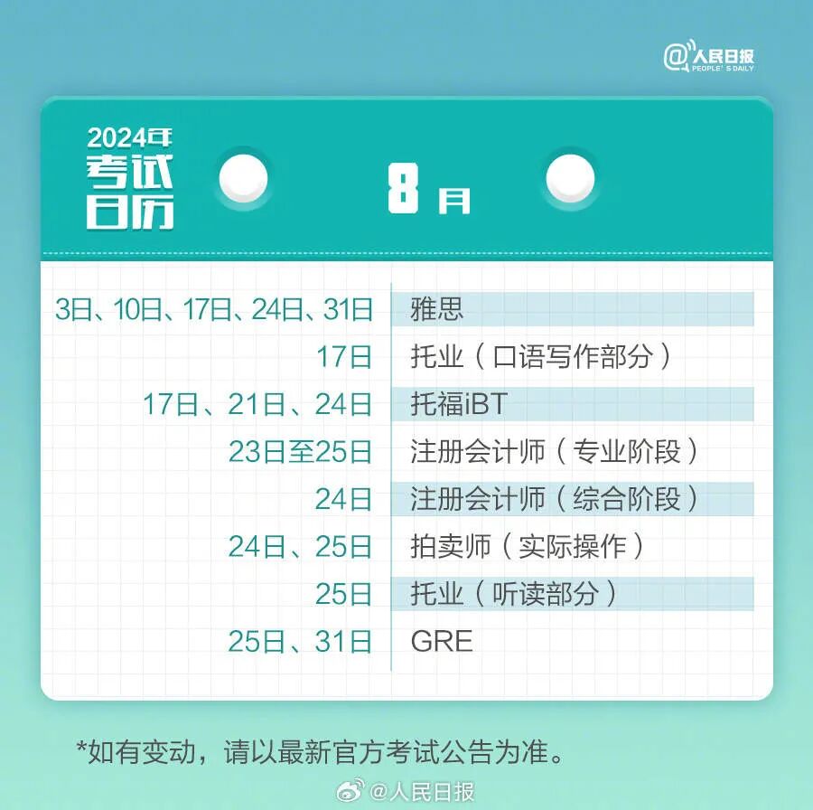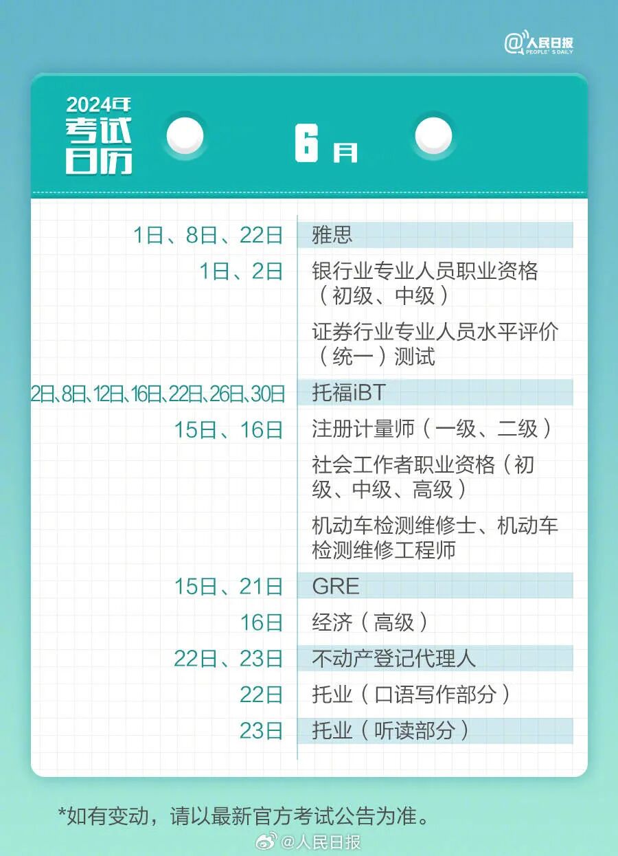 2024年已过去20多天,你的学习考试计划开始了吗?教师资格考试、计算机等级考试、注册会计师、法律职业资格……提前计划,不留遗憾,为目标努力起来!收好2024考试日历↓↓一起加油! (来源:人民日报 编辑:董盈)