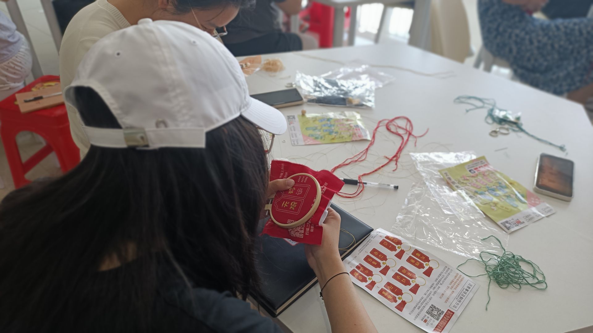 在普及完七夕的来源、风俗及有关“七夕”的诗词后,志愿者向大家展示了缝制“平安喜乐”“万事胜意”祝福语的钥匙扣。学习了基础制作方法后,大家围坐在一起,拿着材料包,开始绷布、穿针、缝纫、剪线,每个人热情高涨,相互帮助指导,在缝纫的过程中,体会传统佳节的乐趣。