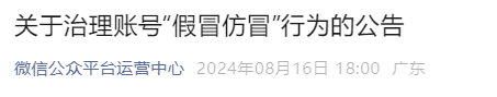 为进一步打造绿色、健康的网络环境,保障平台的内容生态和用户体验,根据《互联网用户账号信息管理规定》和《关于加强“自媒体”管理的通知》等相关规定,微信公众平台对仿冒官方机构、新闻媒体、行政区域及职业资质的情况,展开持续治理。