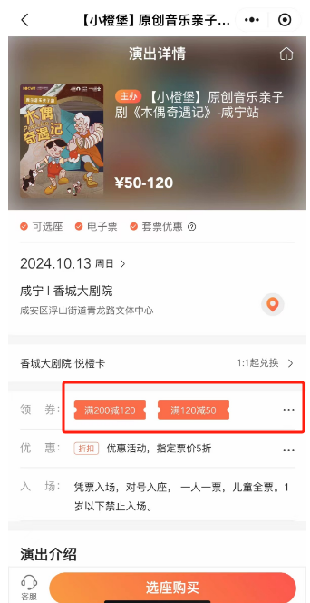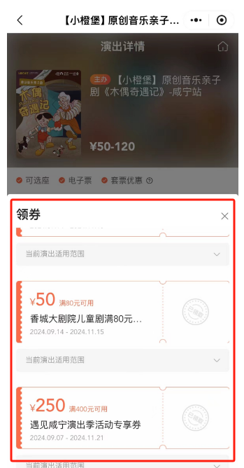 “香城大剧院”微信公众号内领取“文化惠民满减电子消费券”,消费满400元减250元,满200元减120元。
