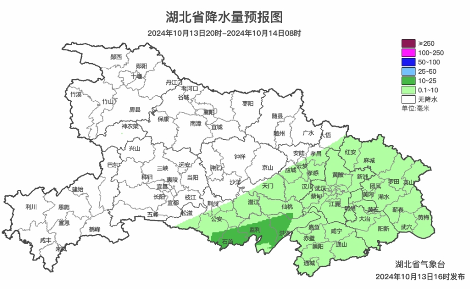 10月16日08时-10月17日08时,鄂西北、鄂西南、江汉平原阴天有小到中雨,局地大雨;其他地区阴天转小雨。最高气温24~28℃,最低气温17~21℃,偏东风2到3级。