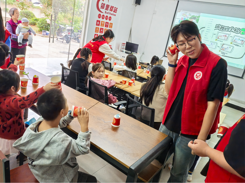 本期课程以“话筒传音”为主题,充满了创意与乐趣。活动现场,志愿者们耐心地为孩子们讲解手工话筒的制作方法,孩子们全神贯注地聆听,一双双明亮的眼睛里充满了好奇与期待。在志愿者的指导下,孩子们纷纷动手,用彩纸、剪刀、胶水等,精心制作出属于自己的手工话筒。不一会儿,一个个色彩斑斓、造型各异的话筒就诞生了。随后,孩子们兴奋地拿着自己制作的话筒,尝试着传音。小小的活动室里充满了欢声笑语。