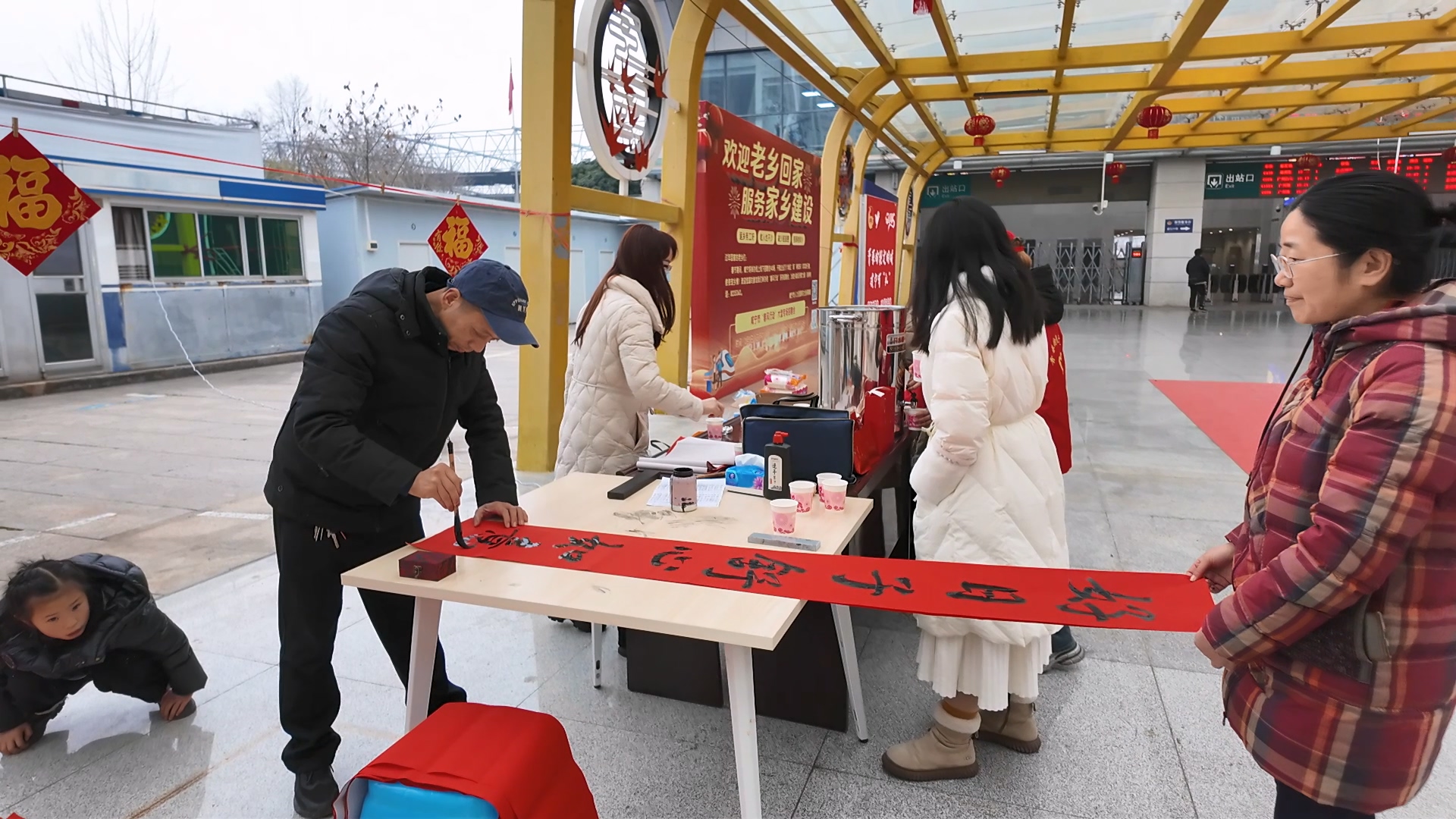 一杯桂茶暖香城,一副春联回咸安。志愿者们将一杯杯热气腾腾的桂花红茶递到旅客手中,馥郁的茶香瞬间驱散了冬日的寒意,让整个车站都沉浸在温暖的氛围里。与此同时,咸安区书法家协会的老师们在现场挥毫泼墨,行书、楷书、隶书等多种字体各具神韵,笔锋游走间,将对新年的美好祝福凝于笔墨。“一帆风顺年年好,万事如意步步高”等饱含吉祥寓意的春联递到返乡旅客手中,让大家提前感受到了浓浓的年味。“一下车就收到这么暖心的礼物,感觉特别亲切,真的太感谢了!”返乡旅客张先生激动地说。
