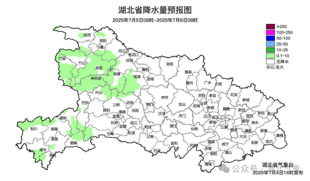 7月5日08时-6日08时,全省晴天到多云,鄂西北、鄂西南午后局地有雷阵雨。最高气温35~39℃、局地40℃,最低气温西部23~26℃、中东部26~30℃,偏南风2到3级、阵风4到5级。