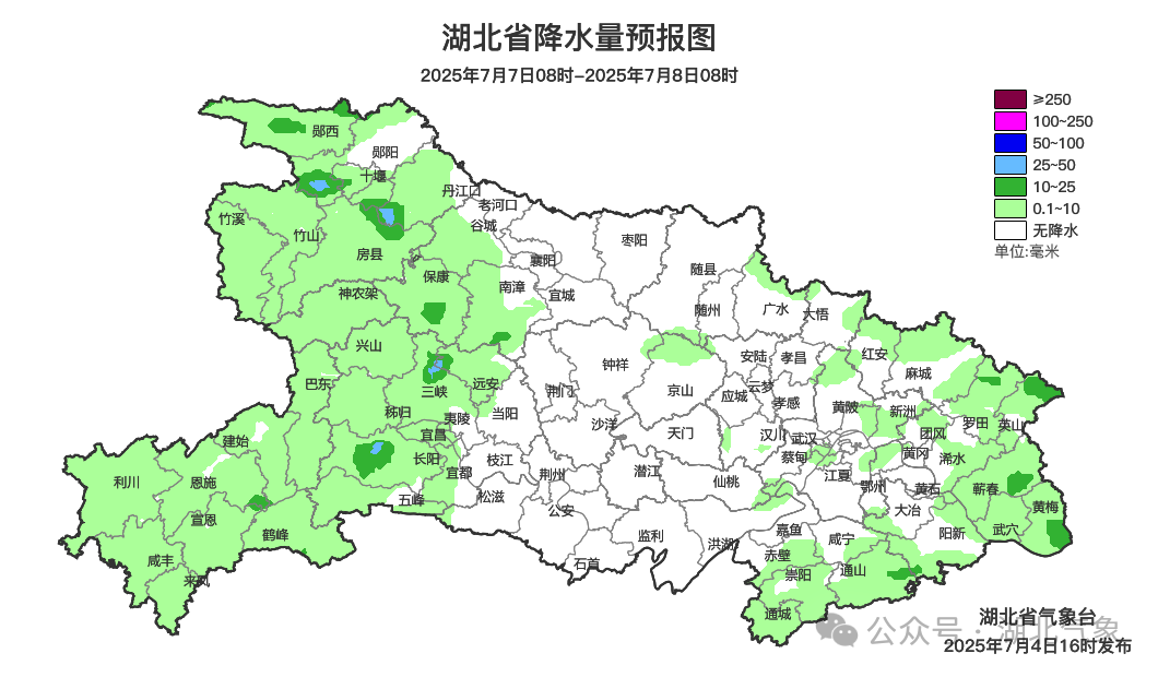 7月7日08时-8日08时,鄂西北、鄂西南、鄂东北、鄂东南多云,局地有雷阵雨;其他地区晴天到多云。最高气温34~38℃,最低气温西部22~26℃、中东部26~30℃,偏东风2到3级、阵风4到6级。