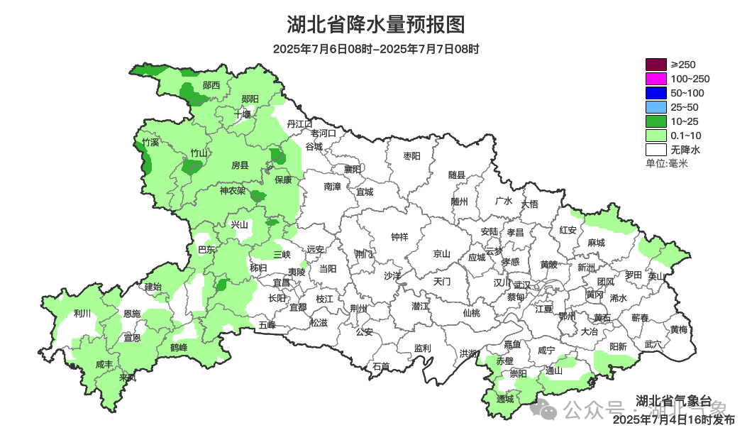 7月6日08时-7日08时,全省晴天到多云,鄂西北、鄂西南、鄂东北东部、鄂东南局地有雷阵雨。最高气温35~39℃,最低气温西部23~26℃、中东部26~30℃,偏东风2到3级、阵风4到6级。