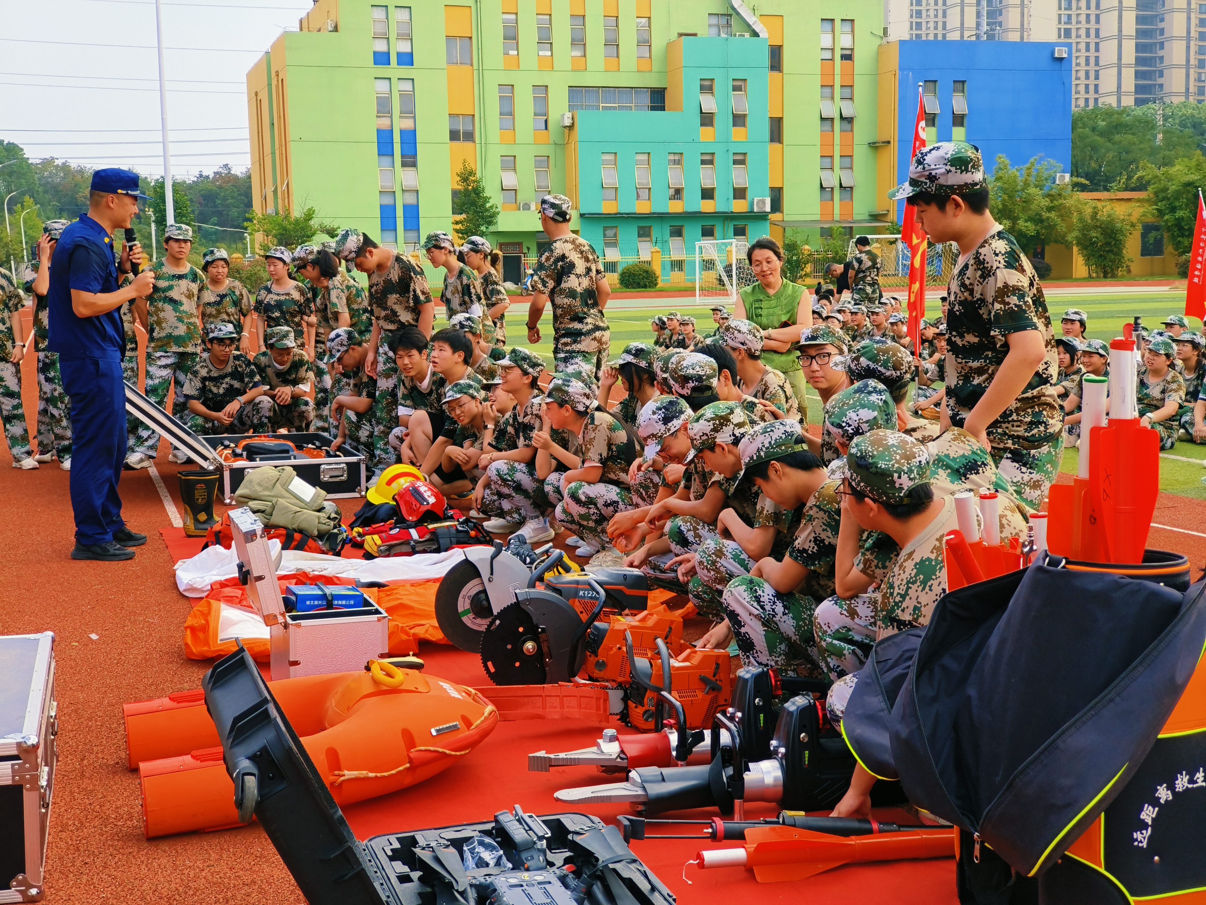 在随后的消防知识培训中,消防员围绕“防火、灭火、报警、逃生”等方面详细讲解,向师生介绍消防器材的使用方法,消防救援人员组织学生代表逐一穿戴各类战斗服,开展灭火实操演练。