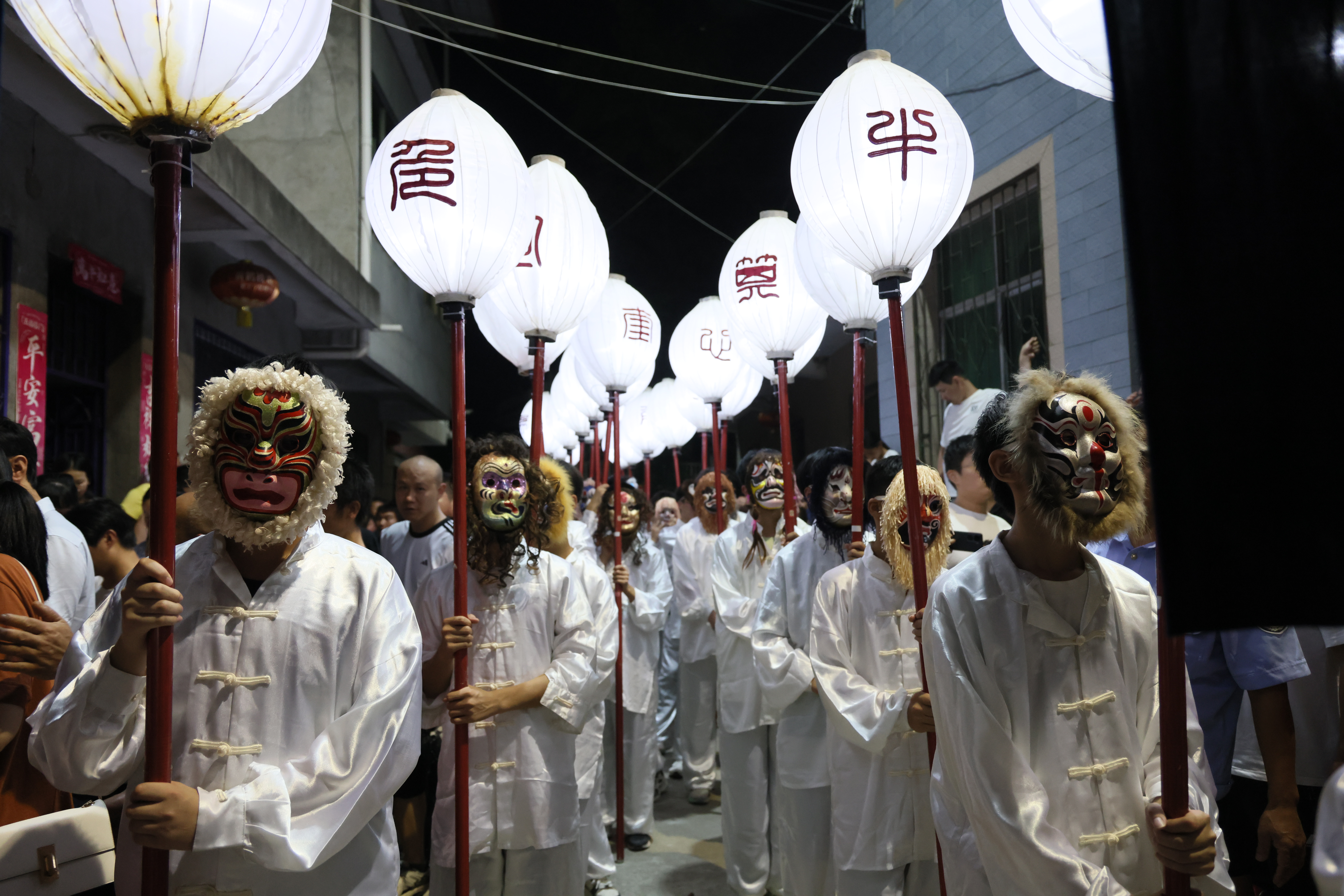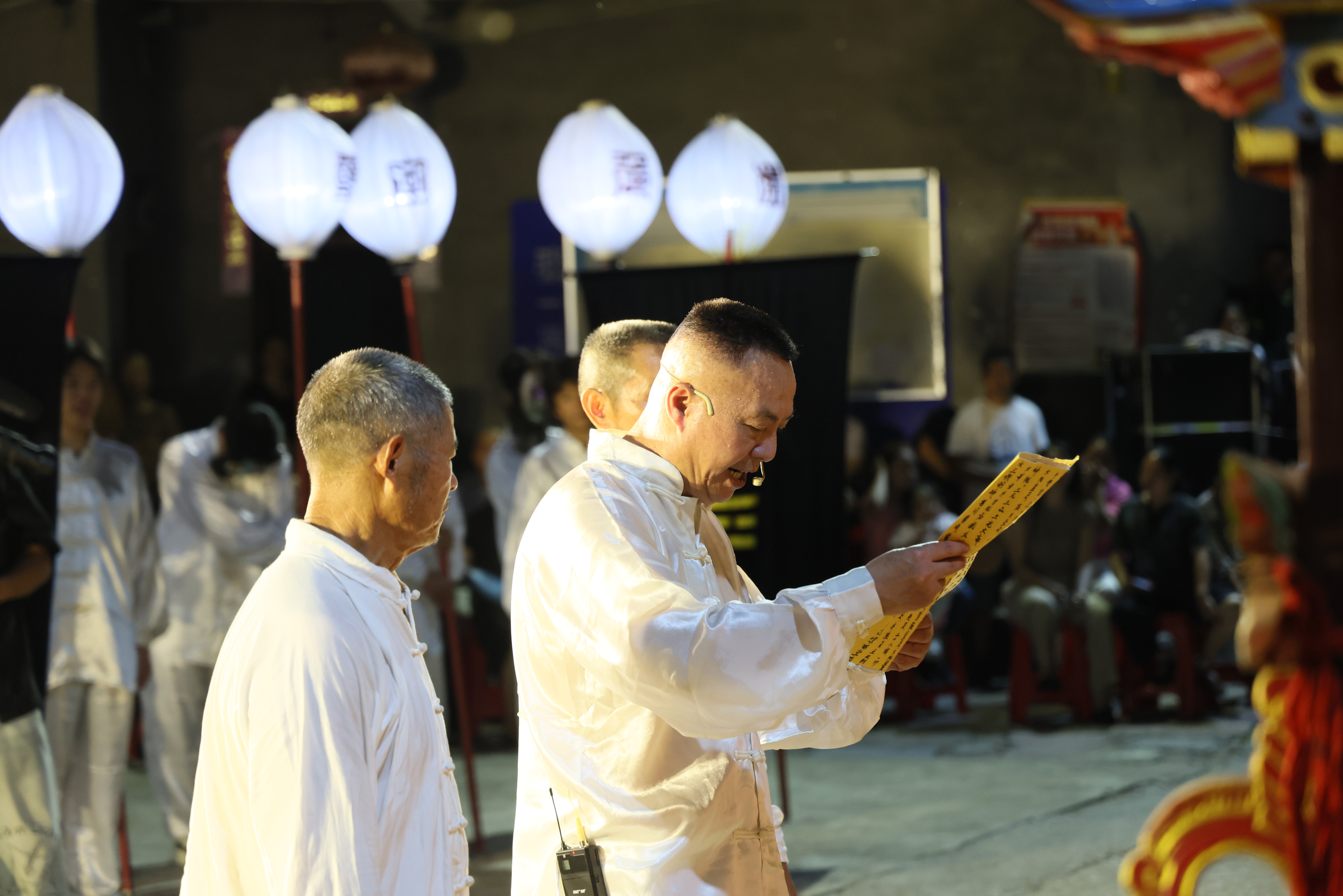 祭月队伍分主祭、神丁、乐队、轿夫和28名星宿,由64人组成。当圆月升至夜空中央,清辉洒满大地,祭月仪式迎来核心环节。在司仪的主持下,身着传统礼服的执事人员神情肃穆,依次完成“告吴主庙”“接日月神牌位”流程。