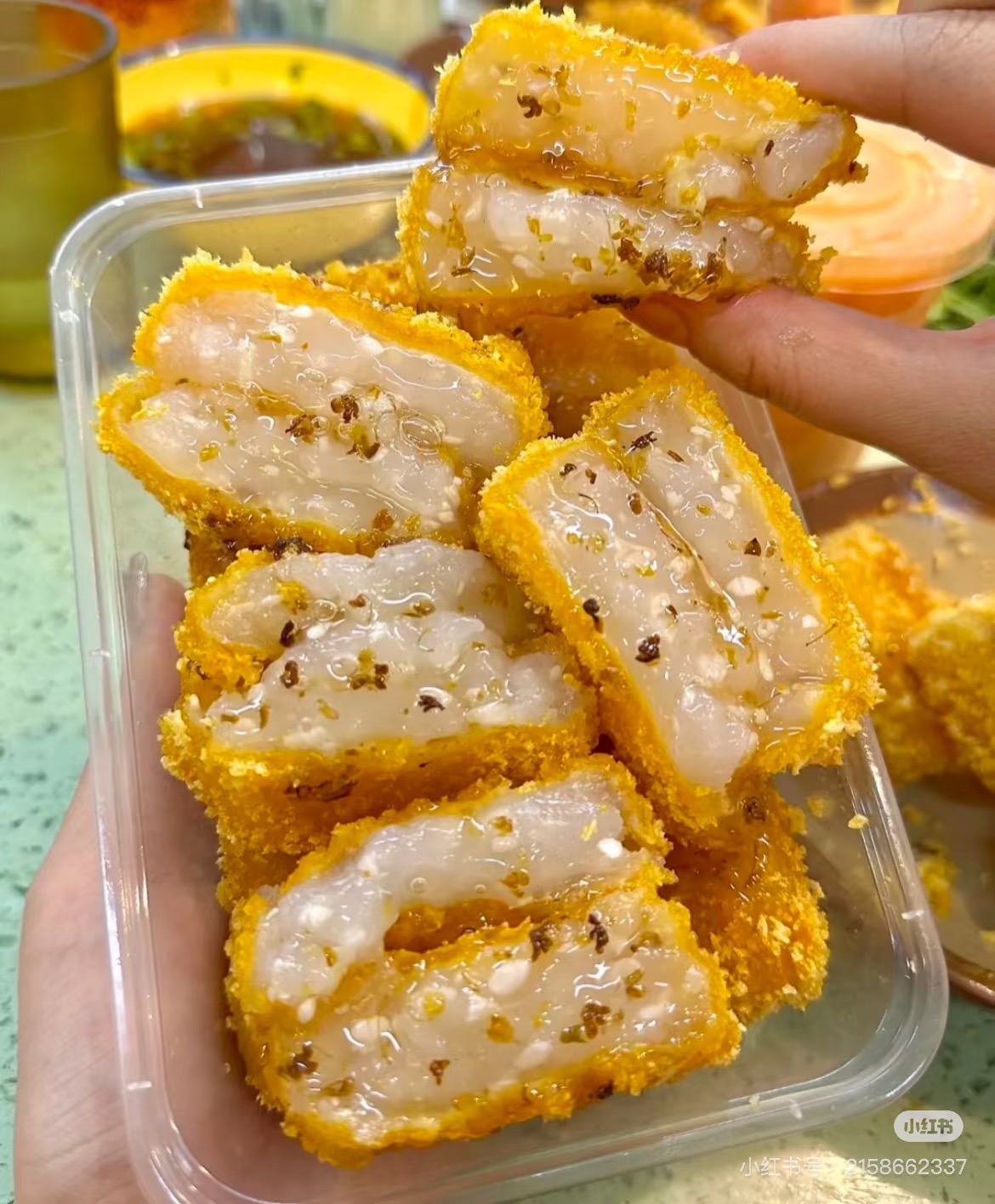 桂花炸酒酿是一道融合了咸宁桂花清甜和米酒醇厚的特色甜品,外酥里嫩,口感丰富,内部则是软糯的米酒馅,口感凉丝丝的,既有米酒的酸甜和醇香,又有桂花的清甜,甜而不腻,老少皆宜。