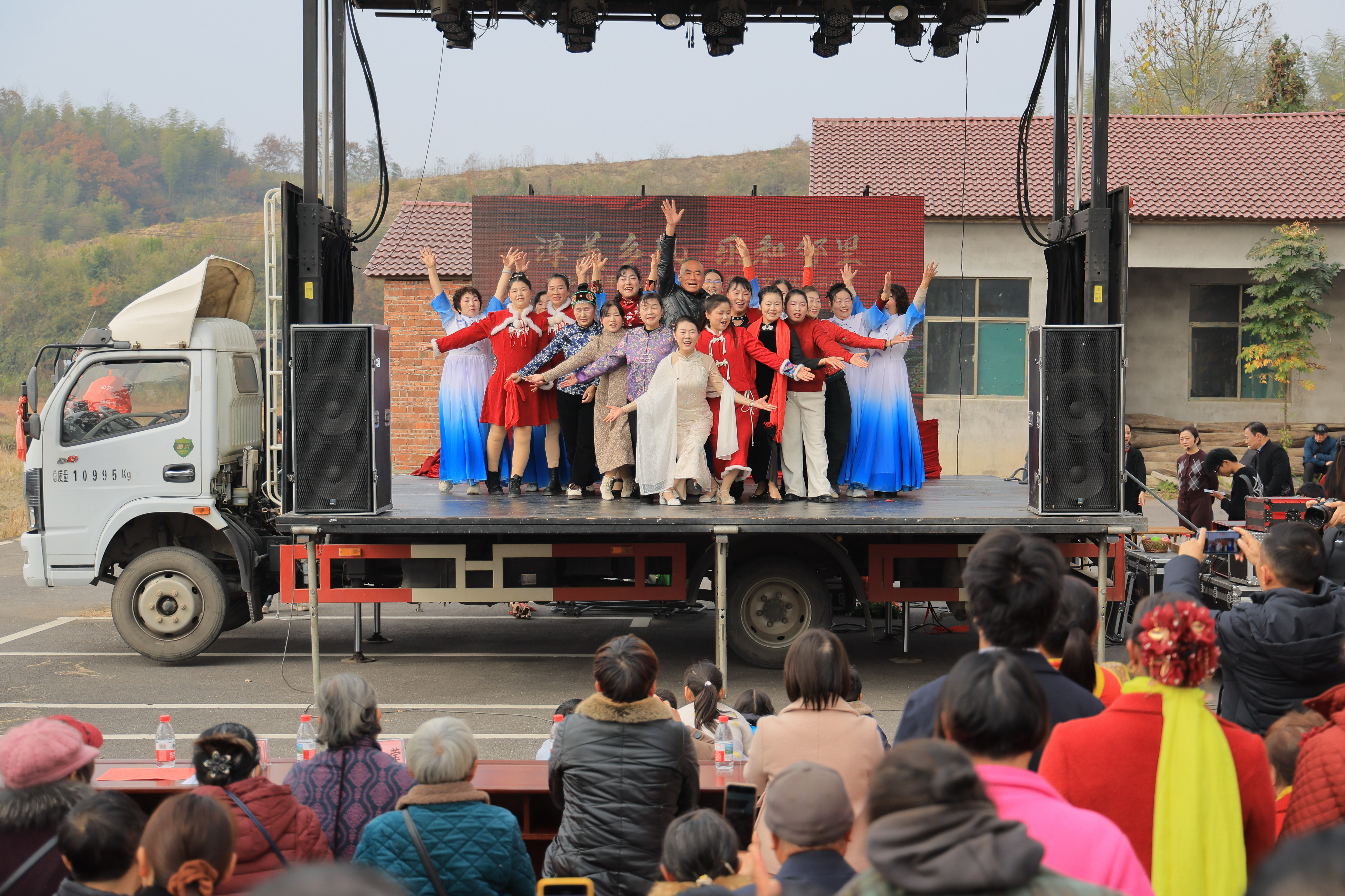 这边厨艺比拼正酣,那边的流动舞台车化身乡村“大舞台”,12个群众喜闻乐见的节目轮番上演。铿锵有力的锣鼓《大幕开场锣》瞬间点燃全场气氛,民俗歌舞《灯哪灯·打花鞭》尽显乡土风情,快板《云秀大幕谱新篇》道出大幕乡的发展新貌,山歌、表演唱、小品、鼓舞等节目精彩纷呈,引得台下观众掌声不断。演出间隙穿插的理论宣讲和有奖知识问答环节,更是将文明知识、社会主义核心价值观融入其中,让大家在欢声笑语中收获满满。