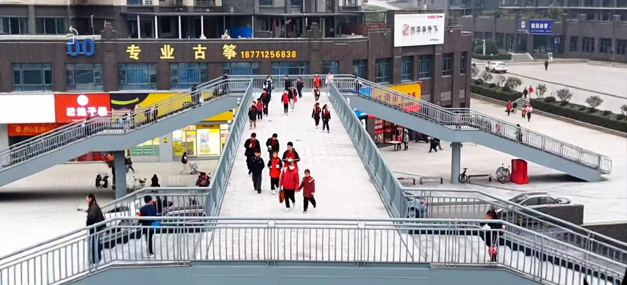 此桥之建,并非凭空而起,实乃岁月积压下的必然回响。崇文街本不宽阔,两校毗邻而居,日日吞吐数千学子:清晨七点半,校门启开,书包晃动如潮汐初涨;下午五点半,铃声一落,人潮奔涌似溪流汇川。家长骑车驻足、电动车穿梭迂回、私家车缓行鸣笛、校车停靠占道……人车交织,寸步踟蹰。安全,成了悬在师生头顶的薄冰;畅通,成了堵在街巷喉头的微尘。