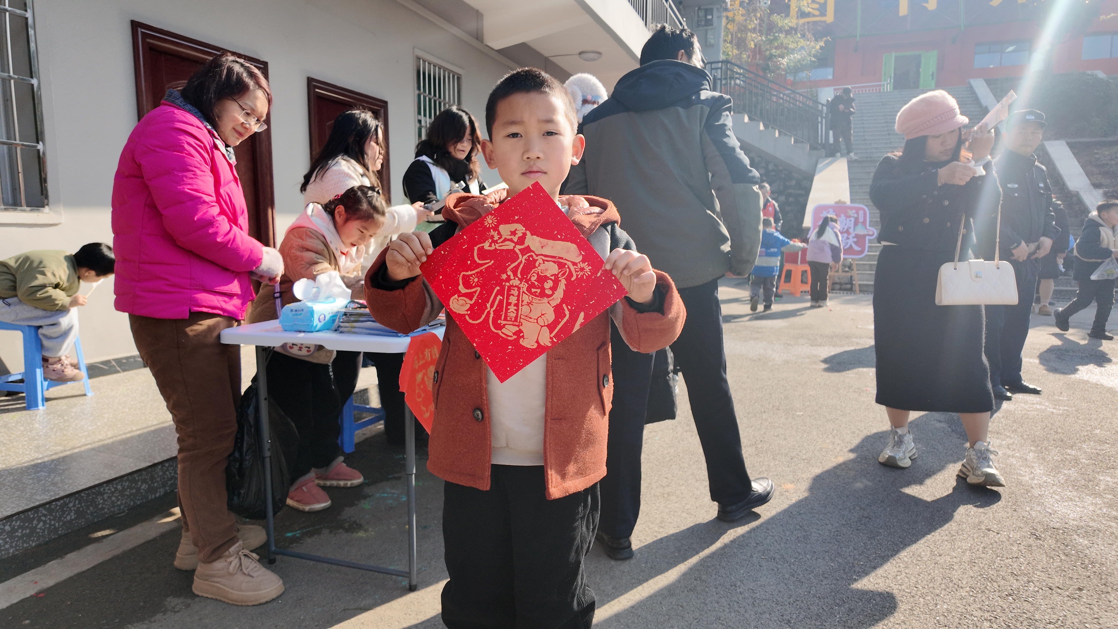 活动现场,图书馆的拓印点位成为热门打卡地,吸引200余名村民和游客参与。工作人员提前精心准备了红纸、拓包、颜料等全套工具,设计了多种拓印模板。既有寓意新春纳福的经典福字,也有骏马迎春、福马送祥等融合2026马年生肖与传统祈福文化的创意图案。工作人员不仅耐心讲解拓印要领,还从红纸铺展、拓包蘸色到均匀按压,手把手指导大家体验拓印技艺。亲子家庭和返乡青年踊跃参与,现场温馨又热闹。