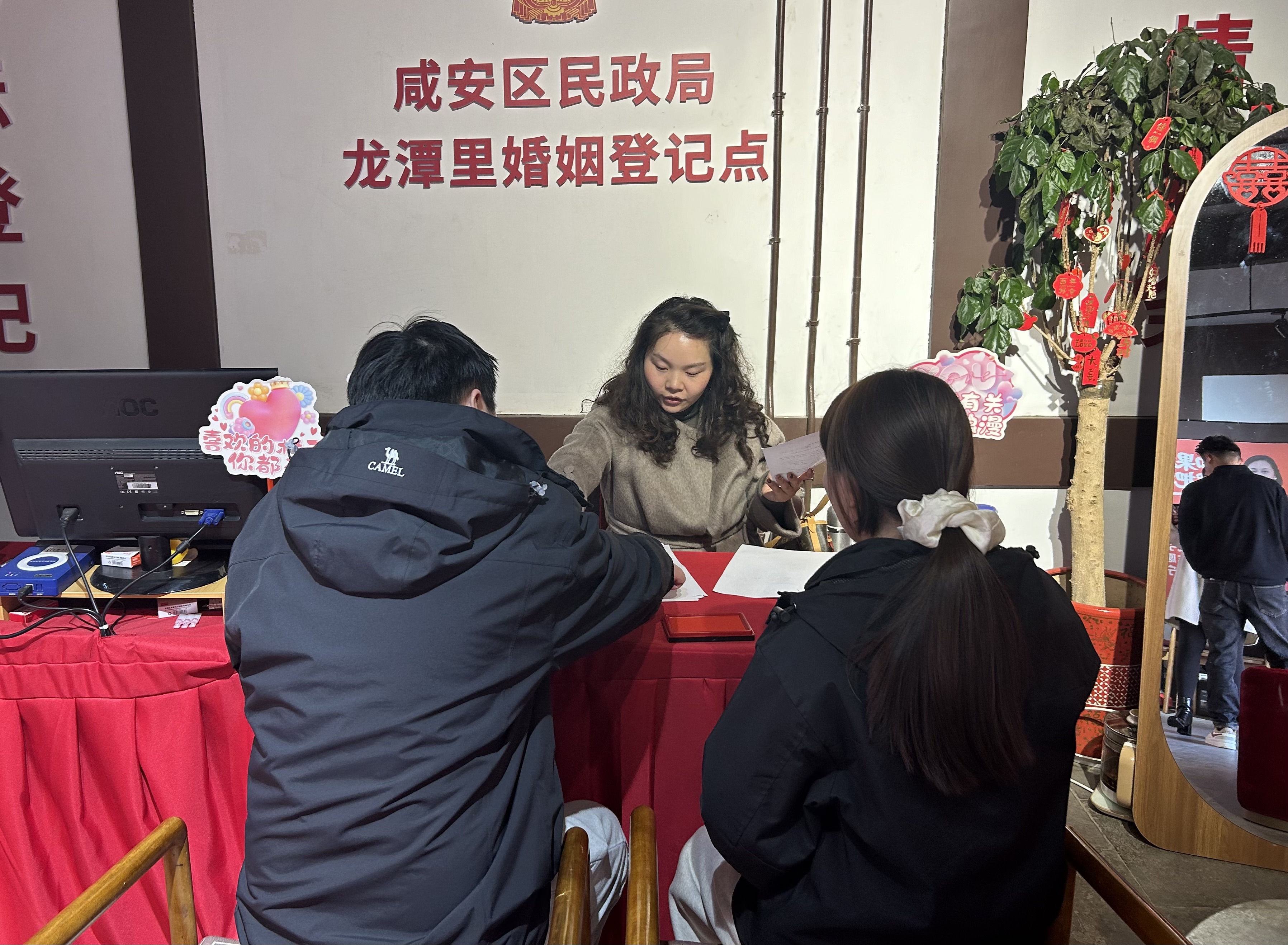 上午9时,市民之家婚姻登记处新人有序排队,工作人员引导办理、高效核验,颁证仪式简约庄重。龙潭里婚姻登记点以景区式场景、汉服打卡、沉浸式颁证等特色服务,成为新人热门打卡点,新人身着传统服饰完成登记,彰显婚俗文化新风尚。