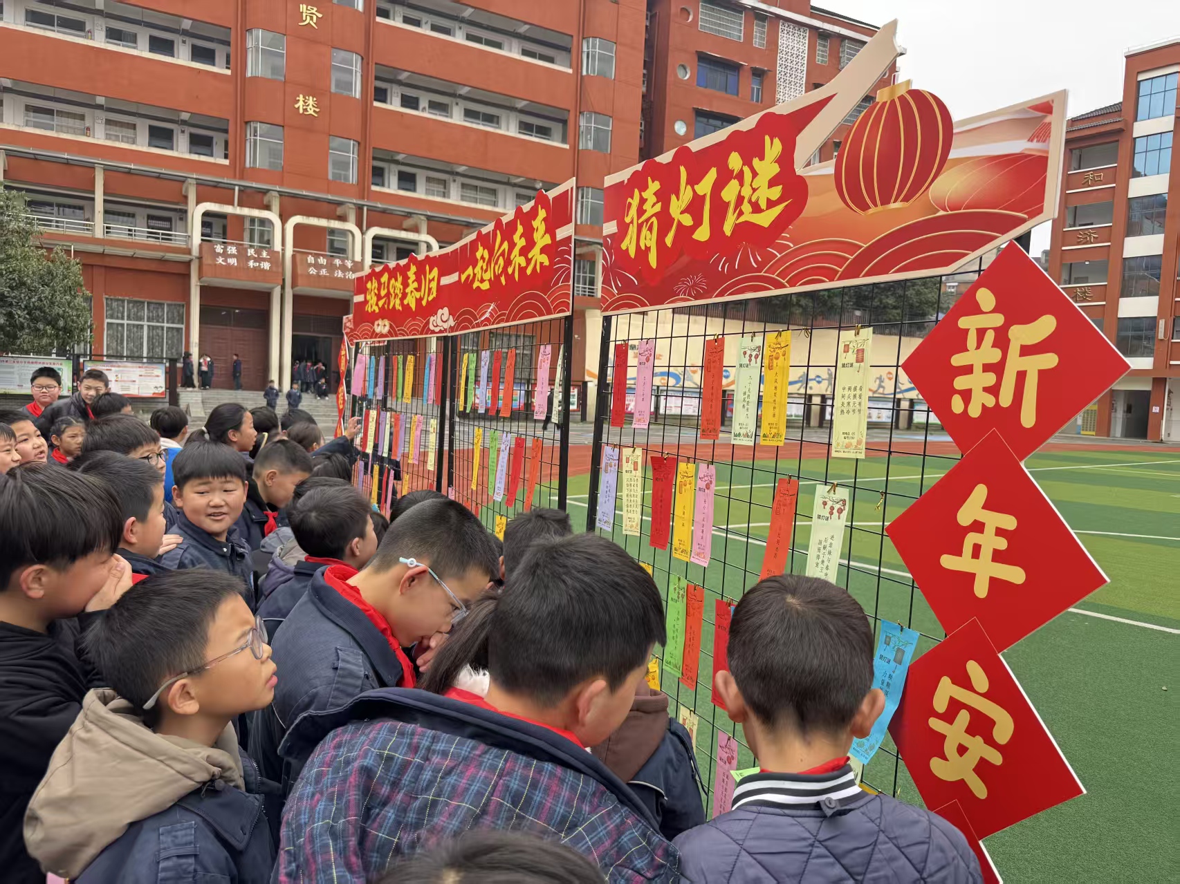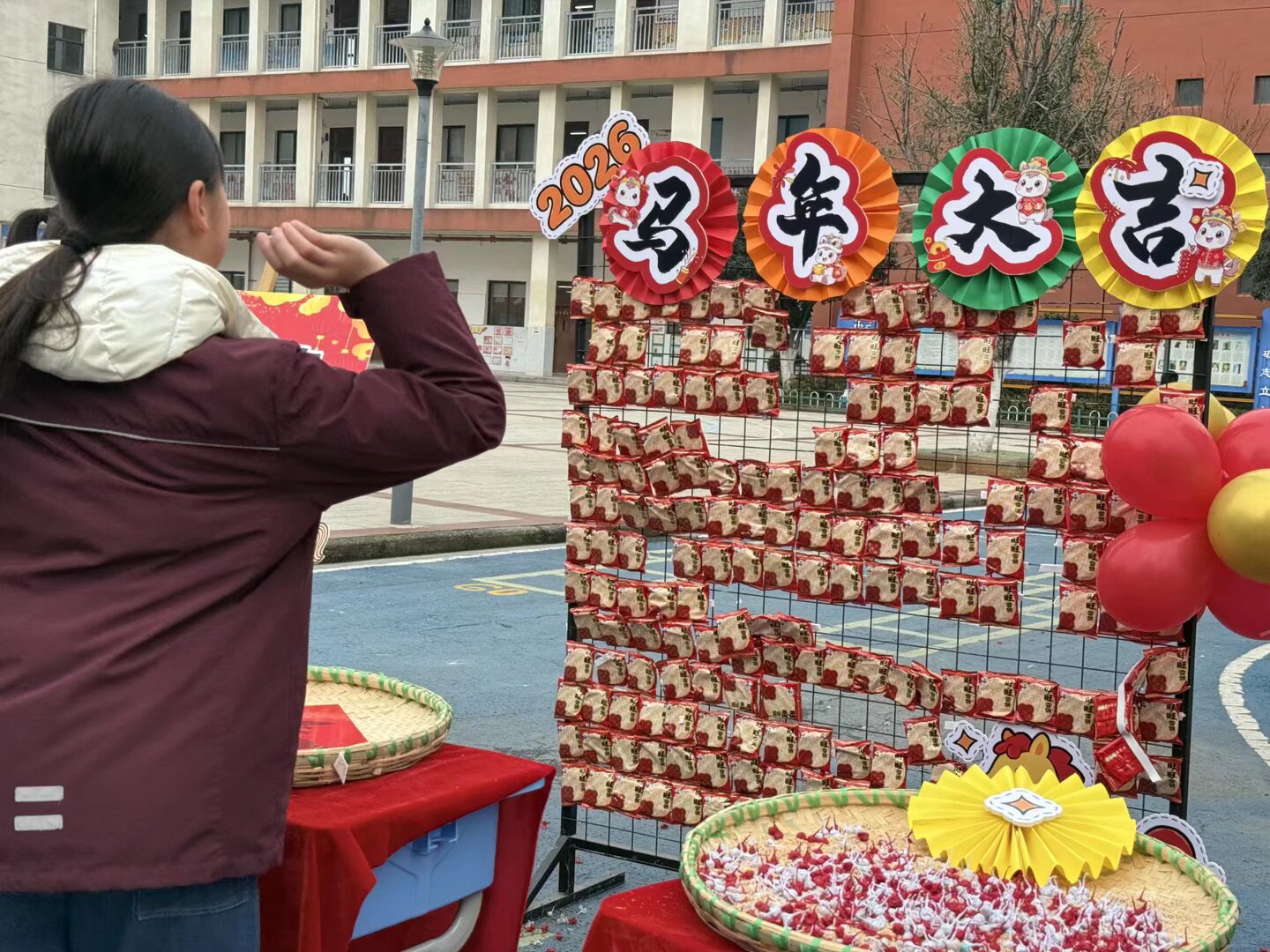 本次开学礼筹备工作细致周全,学校前期完成场地规划、物资筹备、设备调试与人员分工,校门口红毯铺展,气球跨栏搭配“开学快乐”等美好寄语KT板,营造出温馨热烈的入校氛围。七大特色环节动线清晰,仪式感与趣味性兼具:“拍马纳福”环节中,学子轻触福马立牌寄托学业进步心愿;纳新摔响体验区里,安全环保道具的清脆声响寓意摔去懒散、重拾干劲;福礼领取点的旺旺雪饼,传递着“四季兴旺”的甜蜜祝福。
