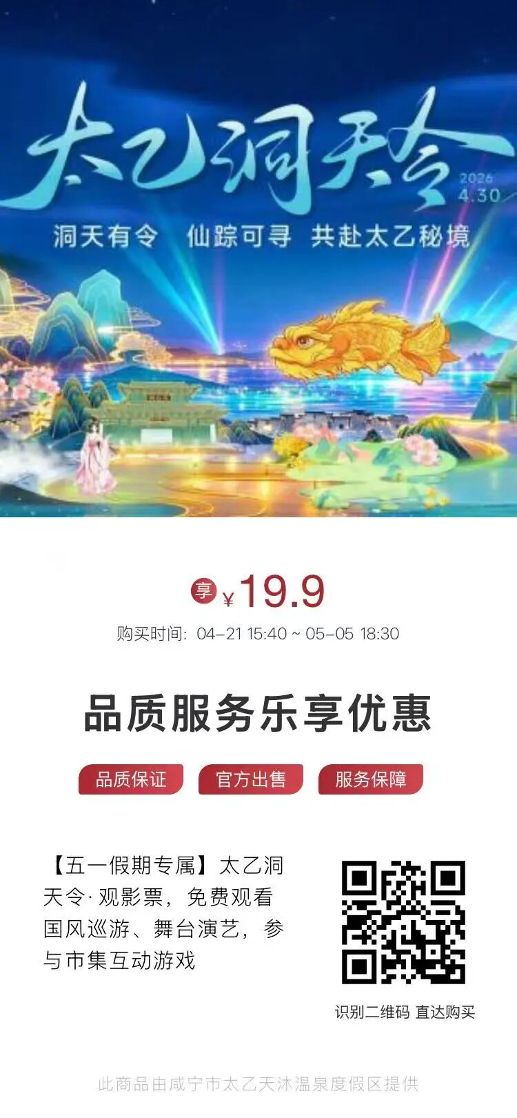 入园需购买19.9元洞天福地贴(洞天福地贴为入园通票),即可领取太乙通关文牒1张(一贴仅兑换一文牒),开启集章打卡之旅。6大点位盖章,集满即可兑换好礼!