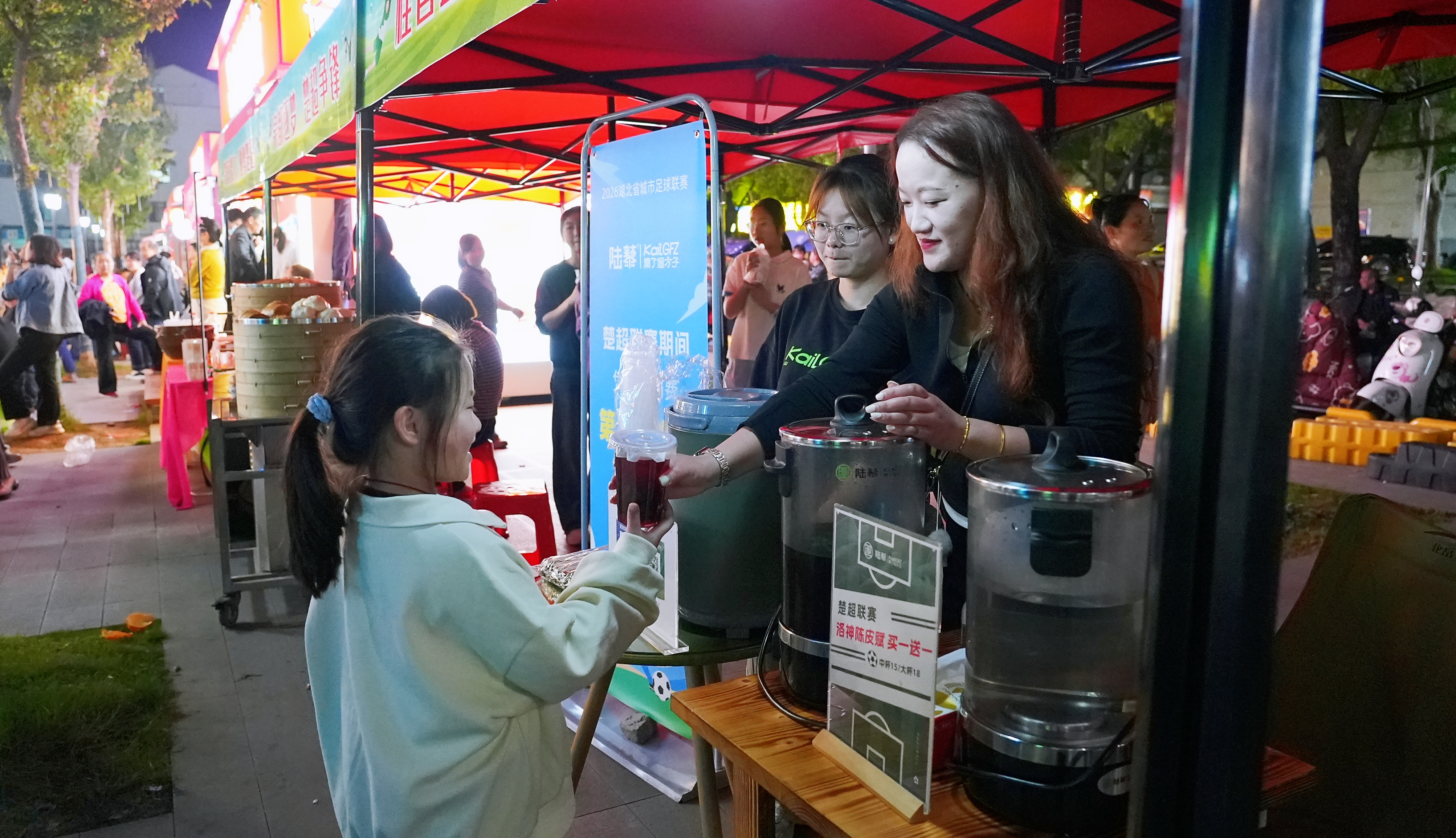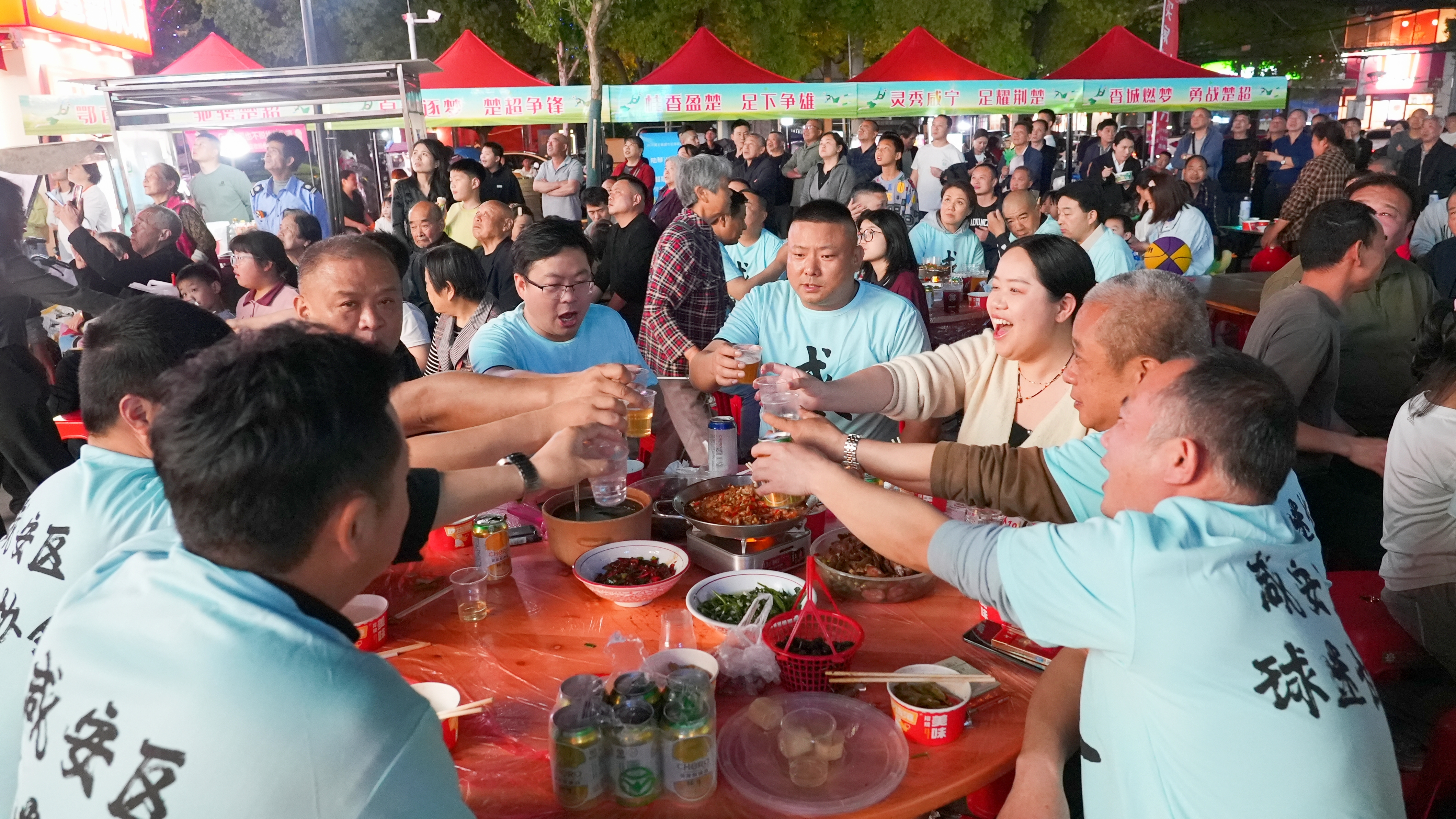 在这里,足球不再是屏幕里的远方,而是啤酒杯的碰撞声、烧烤炉的滋滋声与街边的呐喊声交织出的城市交响曲。望月街中央的户外大屏幕正实时直播崇阳赛场的激烈战况,上百名球迷围坐在一起,将这条美食街变成了名副其实的“第二现场”。记者走访发现,以望月街为代表的咸安“夜经济”集聚区,正因这场赛事焕发出前所未有的活力。