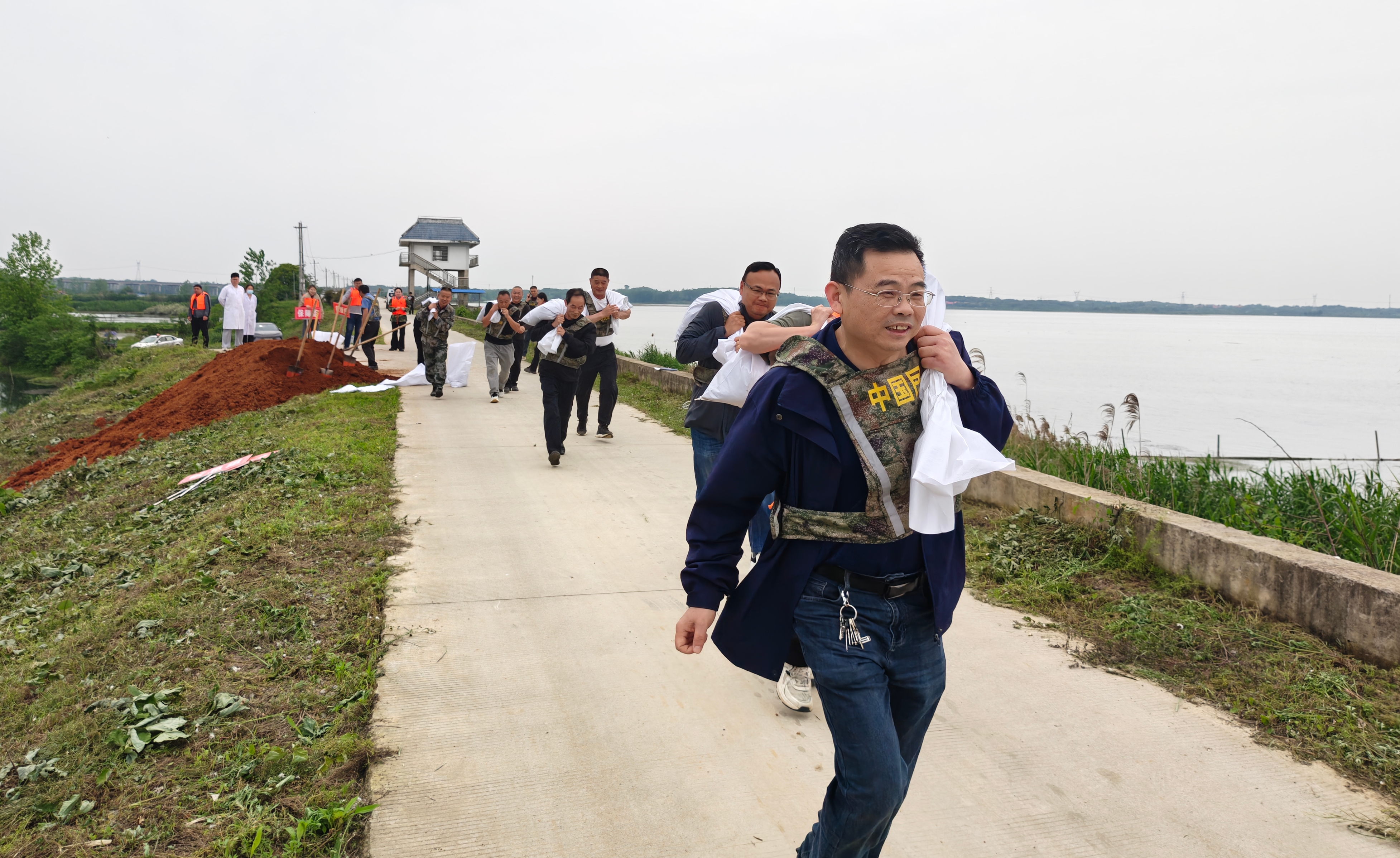 仪式结束后,队伍迅速转移至向阳湖垸堤八字口段,投入防汛抢险应急演练实战。此次演练模拟淦河因强降雨出现管涌险情,威胁下游雨坛村群众安全。预警信号发布后,民兵突击队迅速行动,搬运沙袋、抢筑围井;救援组有序引导群众转移至防汛哨所安置点;医护人员对模拟突发疾病的群众进行紧急救治。整个“预警——转移——安置——保障”流程紧密衔接,成效显著。