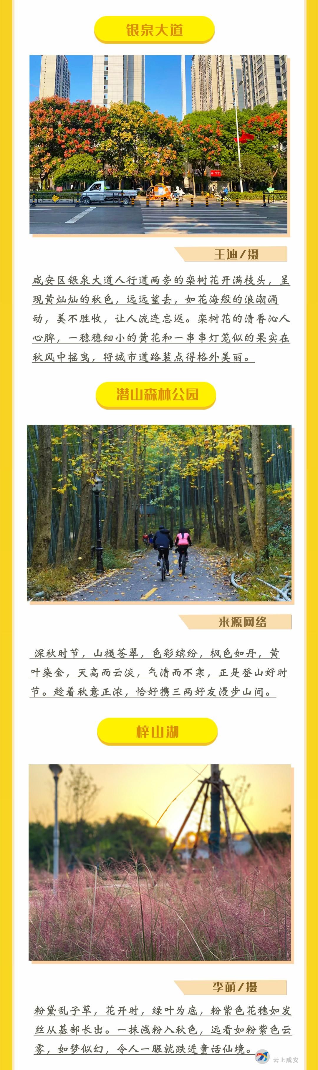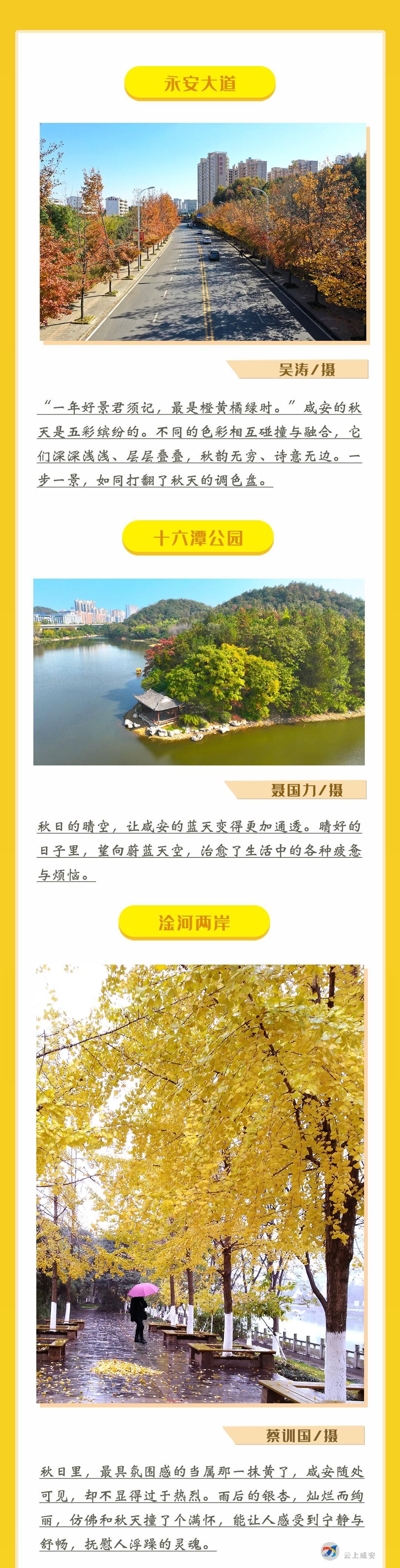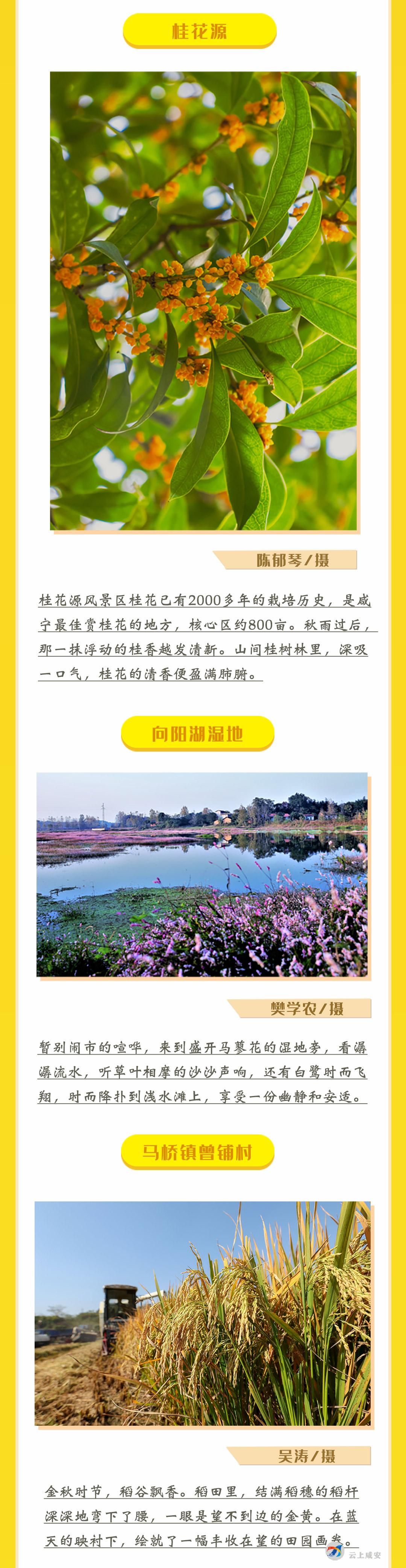 桂花染上焦糖色,摇落一地金黄 香樟披上渐变色,初黄青绿间更有韵味 不知不觉间 咸安拥有了层次丰富的秋天 今年,秋天仿佛变长了,也更美了 让我们来一同打卡咸安秋日美景~ ▼▼▼ 秋天的咸安 一草一木都染上了专属秋天的色彩 而咸安的天气也和秋天的色彩一样明媚 趁阳光正好,趁微风不燥 快去户外 寻找藏在秋日里的美好吧~ (设计:方焱 责编:余娅敏)
