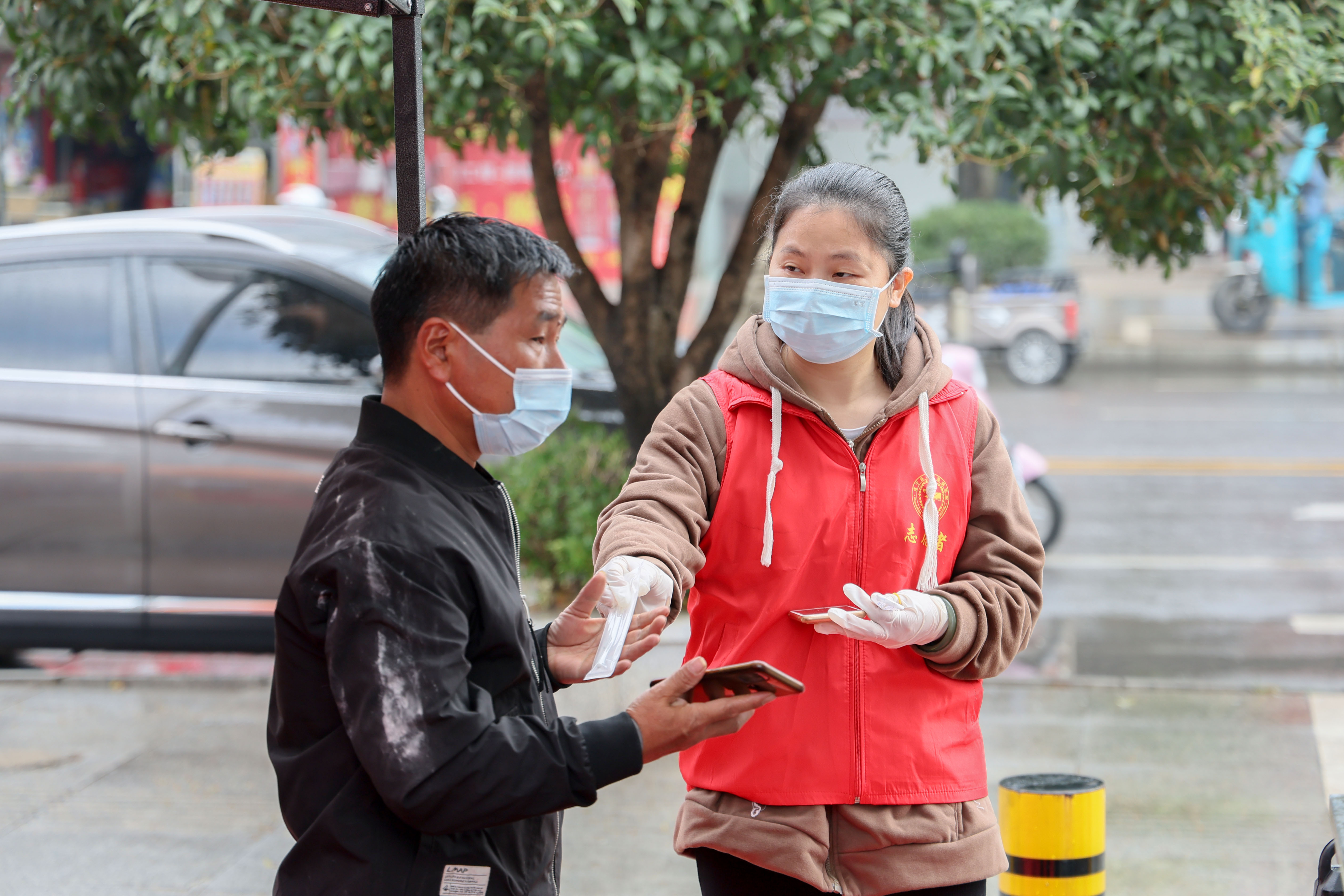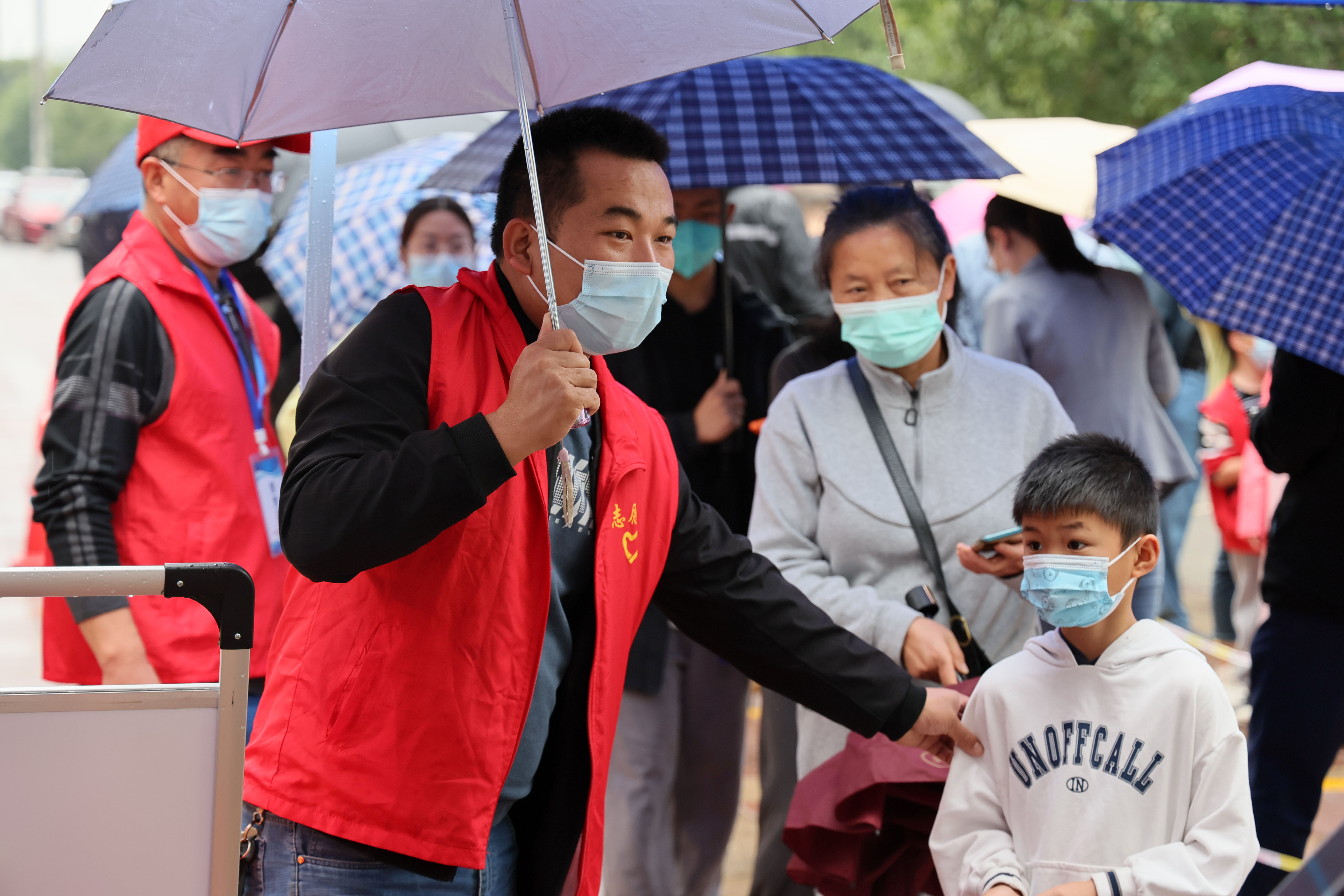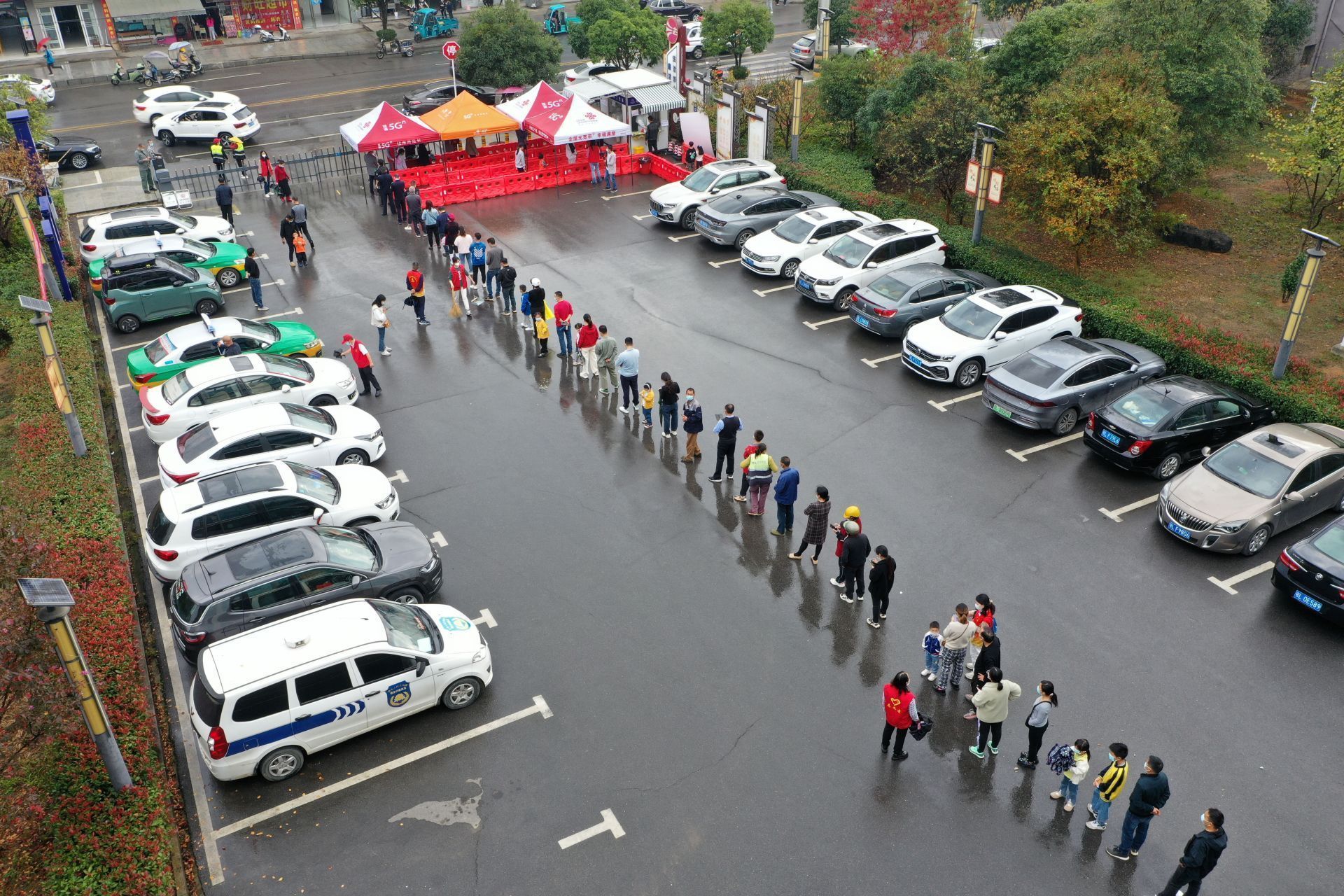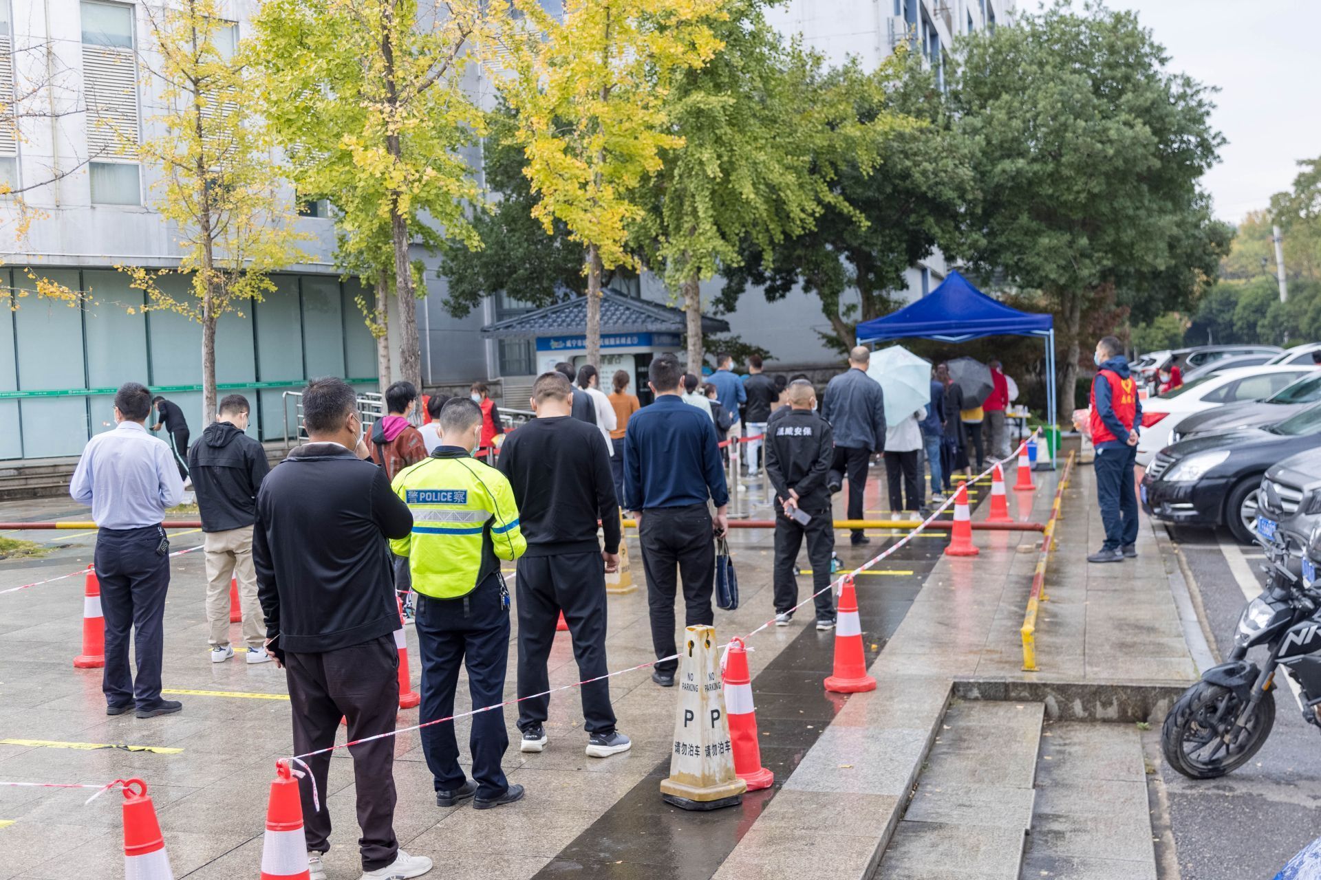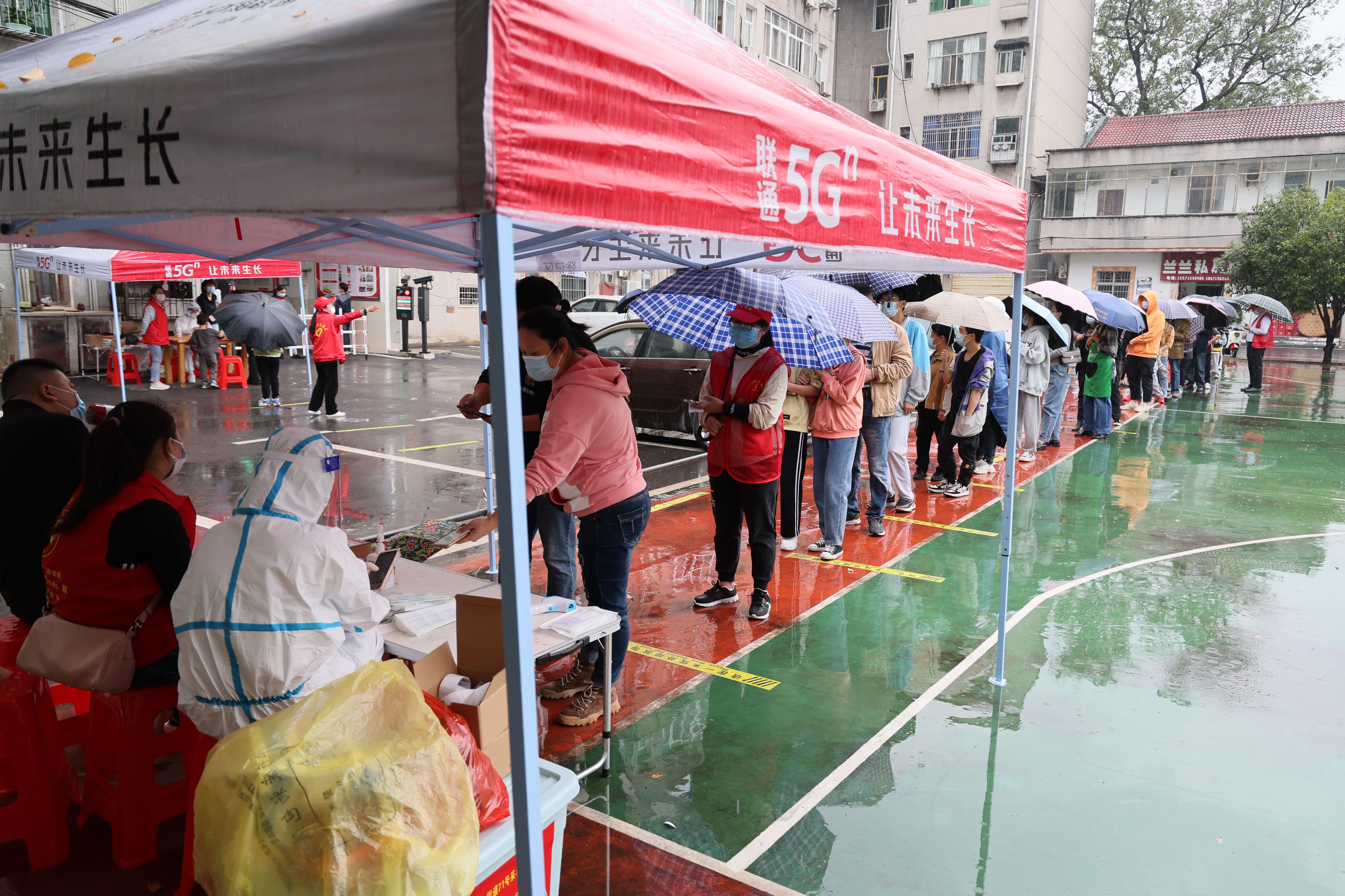 天空中下起了蒙蒙细雨,社区工作人员、志愿者、下沉社区的党员干部们毫不畏惧,雨中坚守,小区里志愿者用喇叭提示居民到指定核酸采样点采样,大家各司其职,相互配合,同心抗疫,科学高效推进核酸筛查。