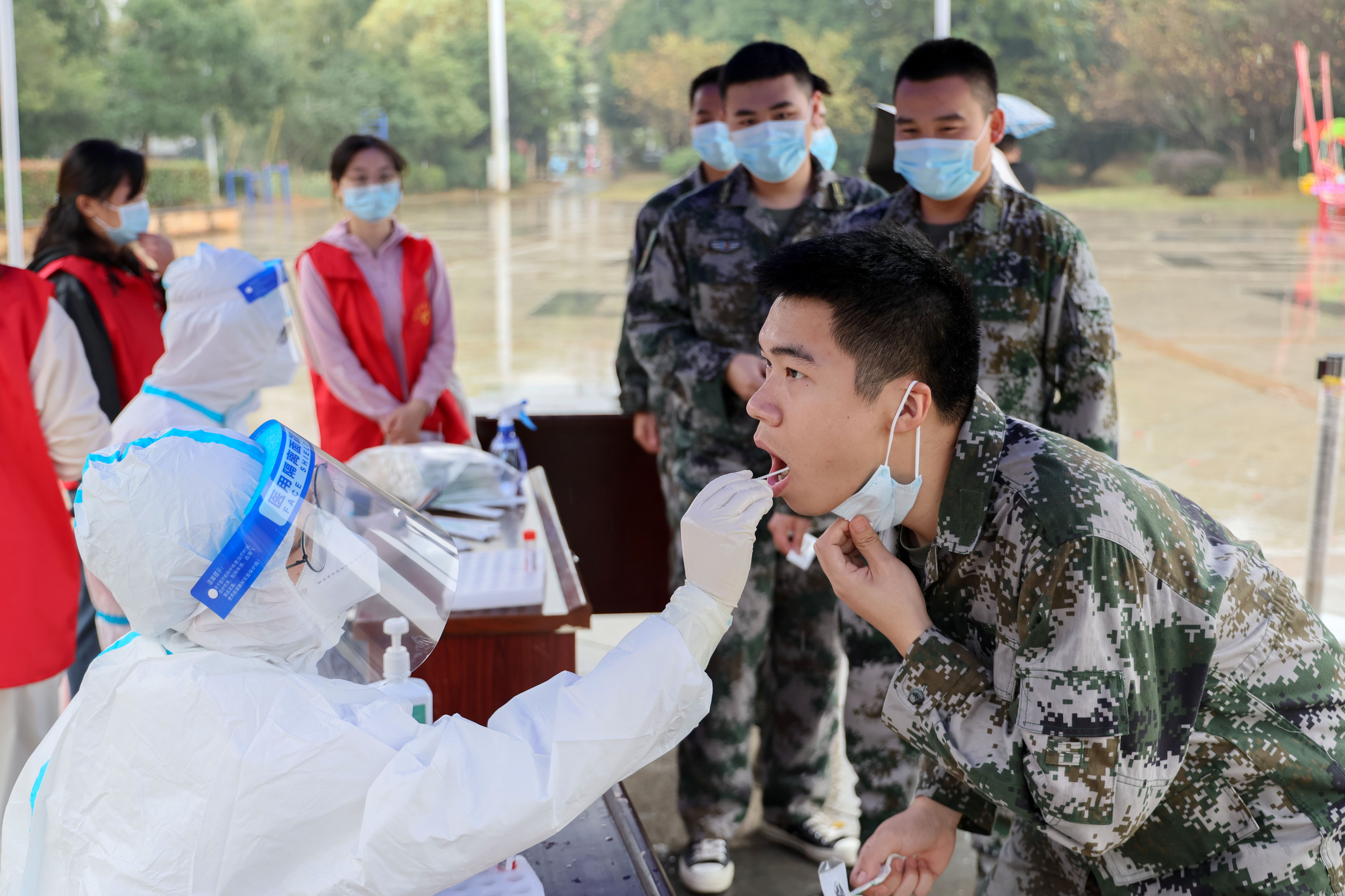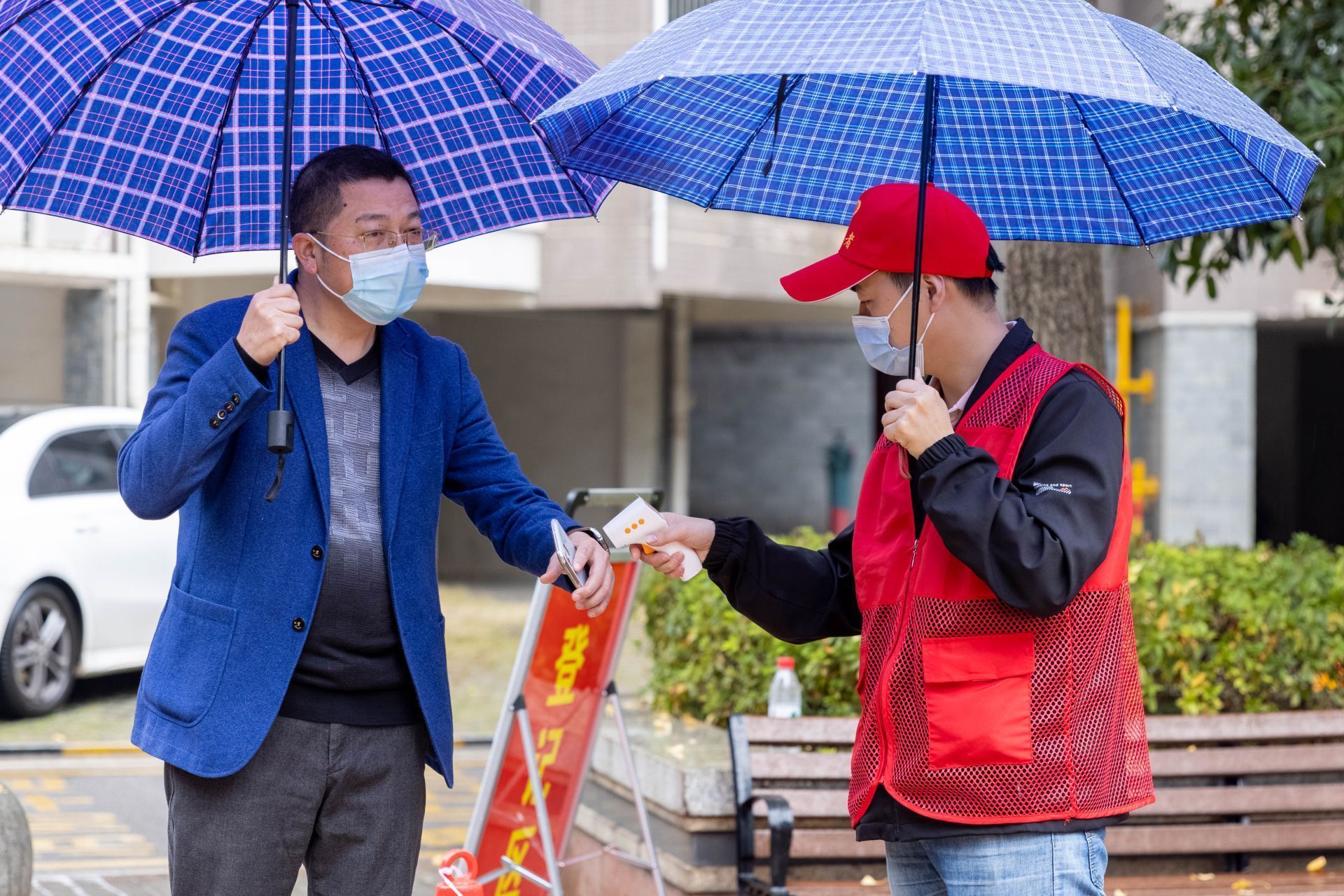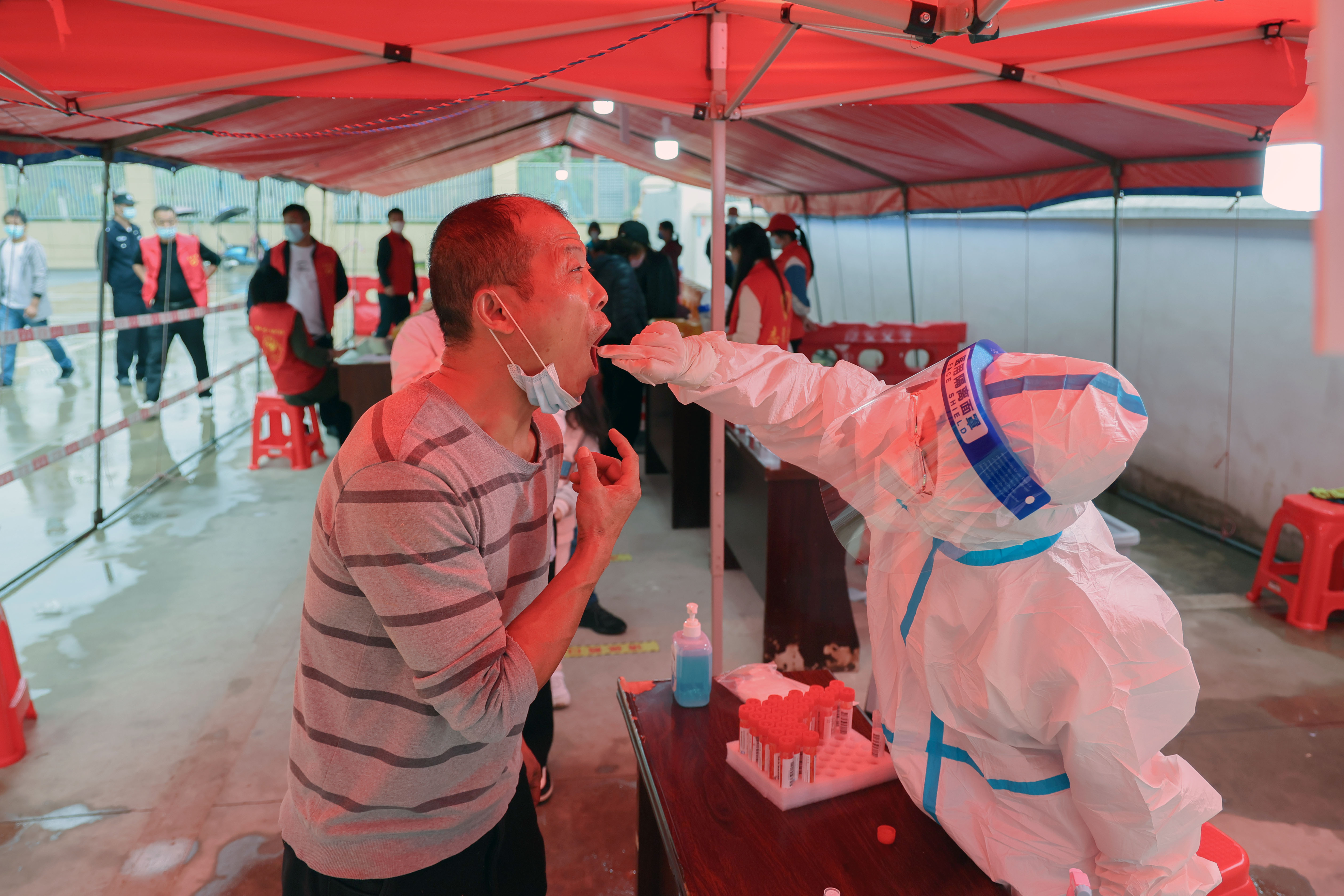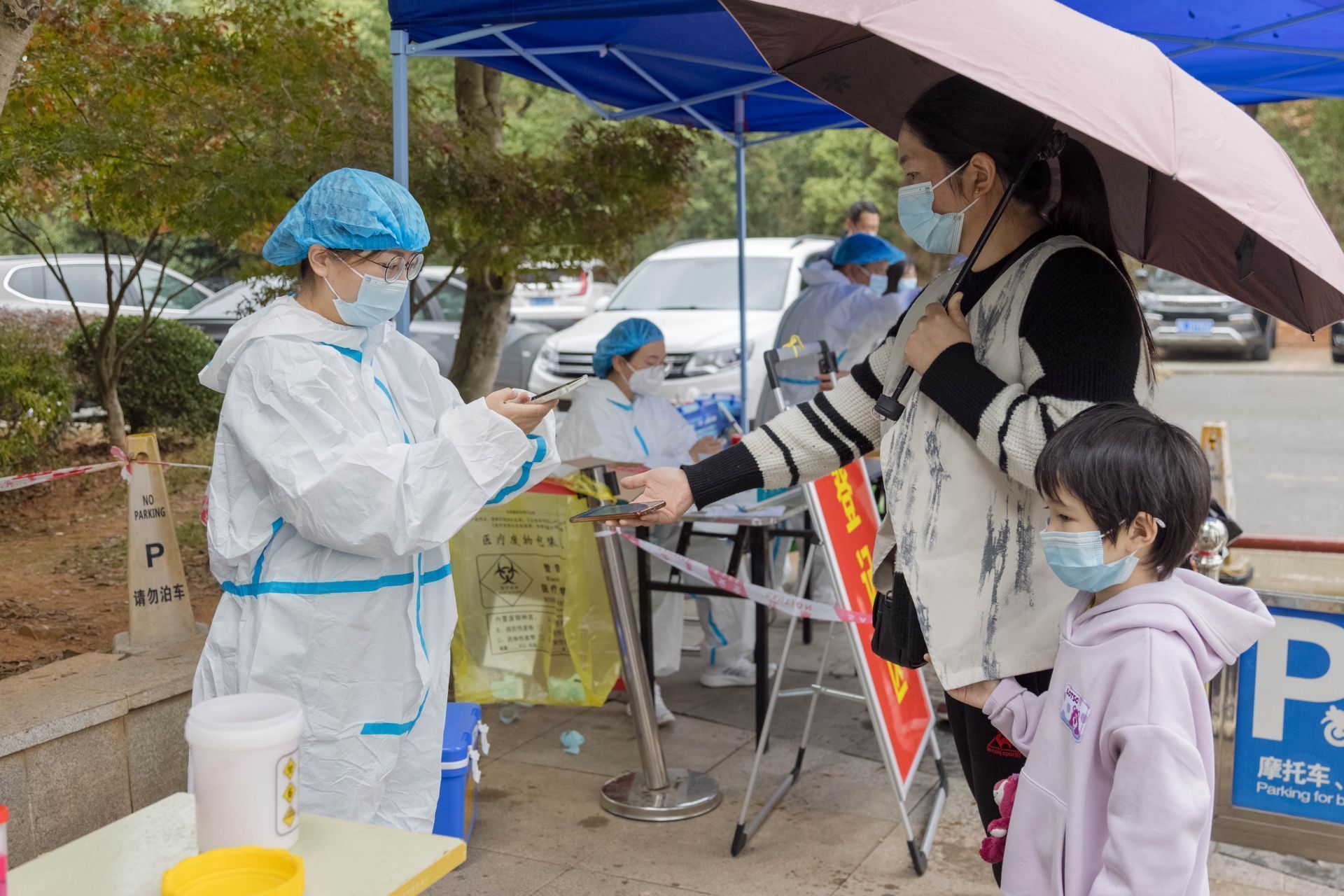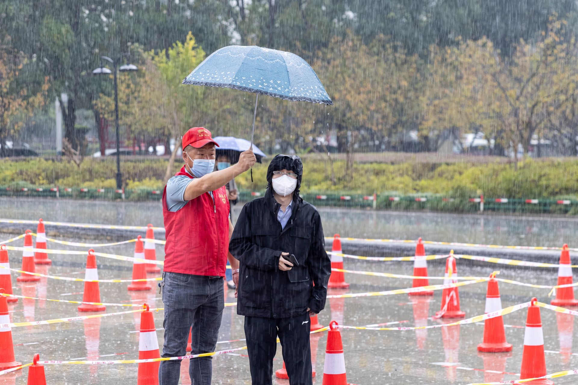 天空中下起了蒙蒙细雨,社区工作人员、志愿者、下沉社区的党员干部们毫不畏惧,雨中坚守,小区里志愿者用喇叭提示居民到指定核酸采样点采样,大家各司其职,相互配合,同心抗疫,科学高效推进核酸筛查。